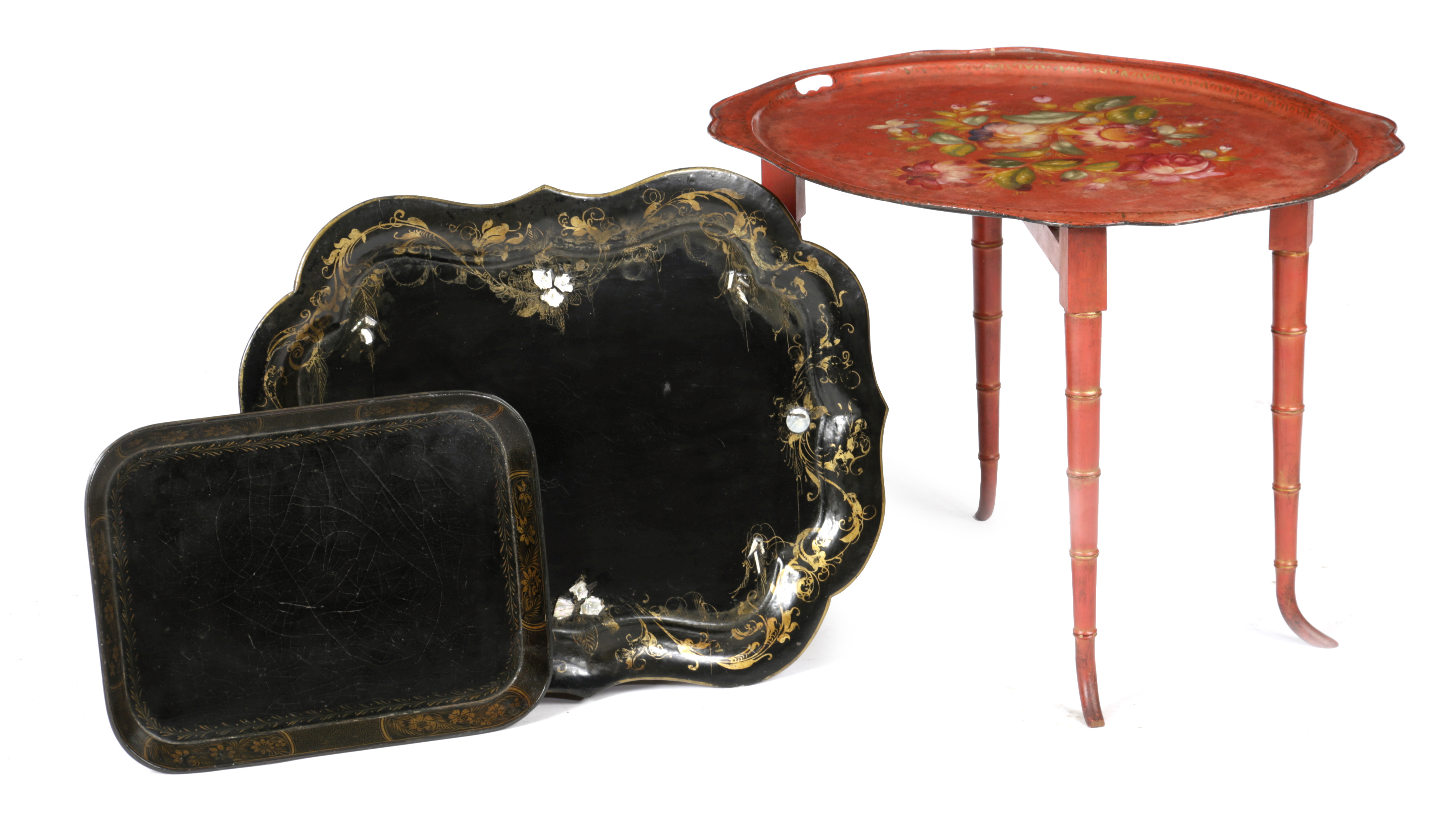 one by Clay with gilt borders and stamped 'Clay, King St. Covt Garden', the other inlaid with mother of pearl, each on an associated stand, together with a red tôle peinte tray on a folding faux bamboo stand and another papier-mâché tripod table (4)