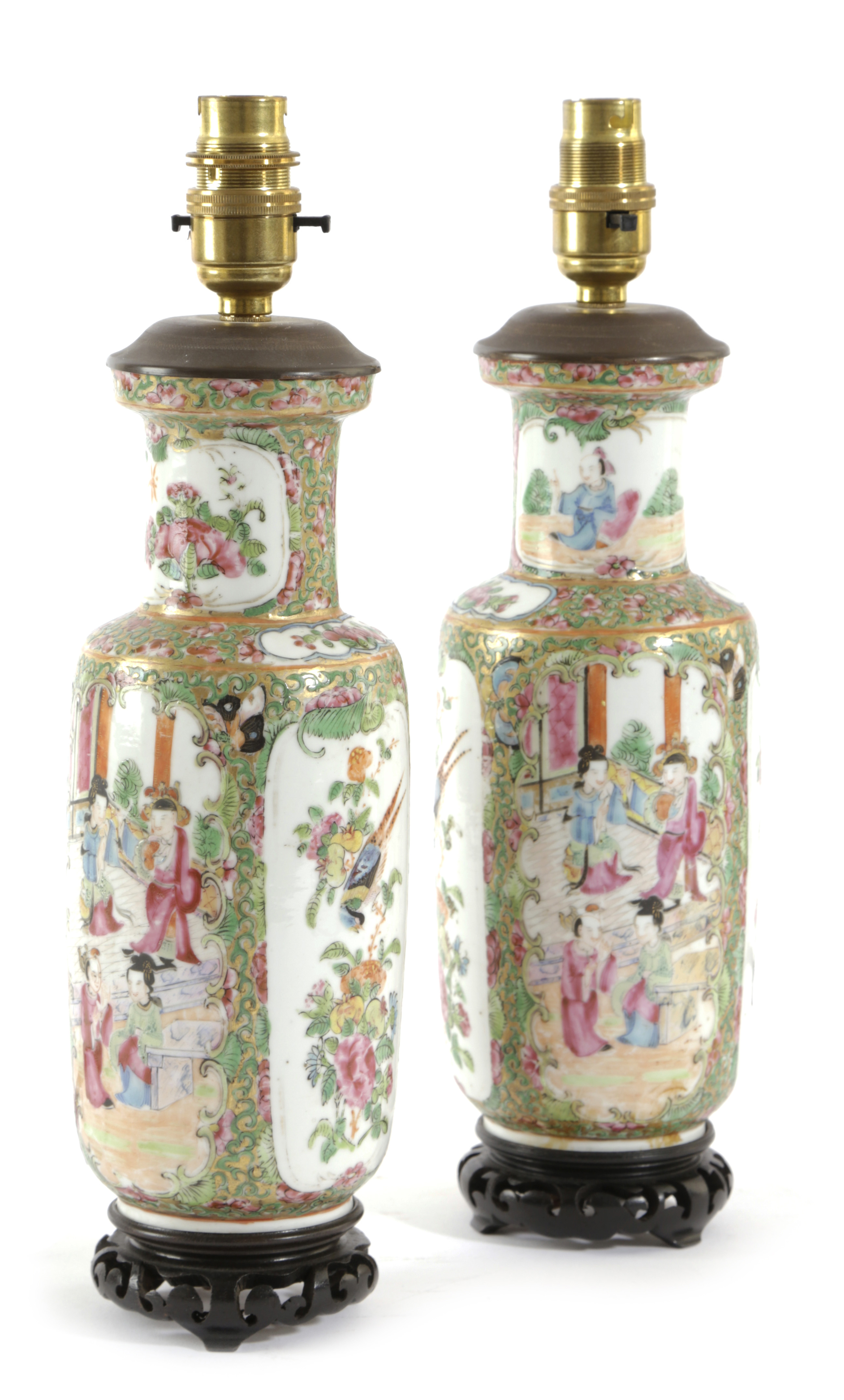 each painted with the Mandarin famille rose palette with panels of figures and birds, mounted on a hardwood stand, with shades, fitted for electricity (2)