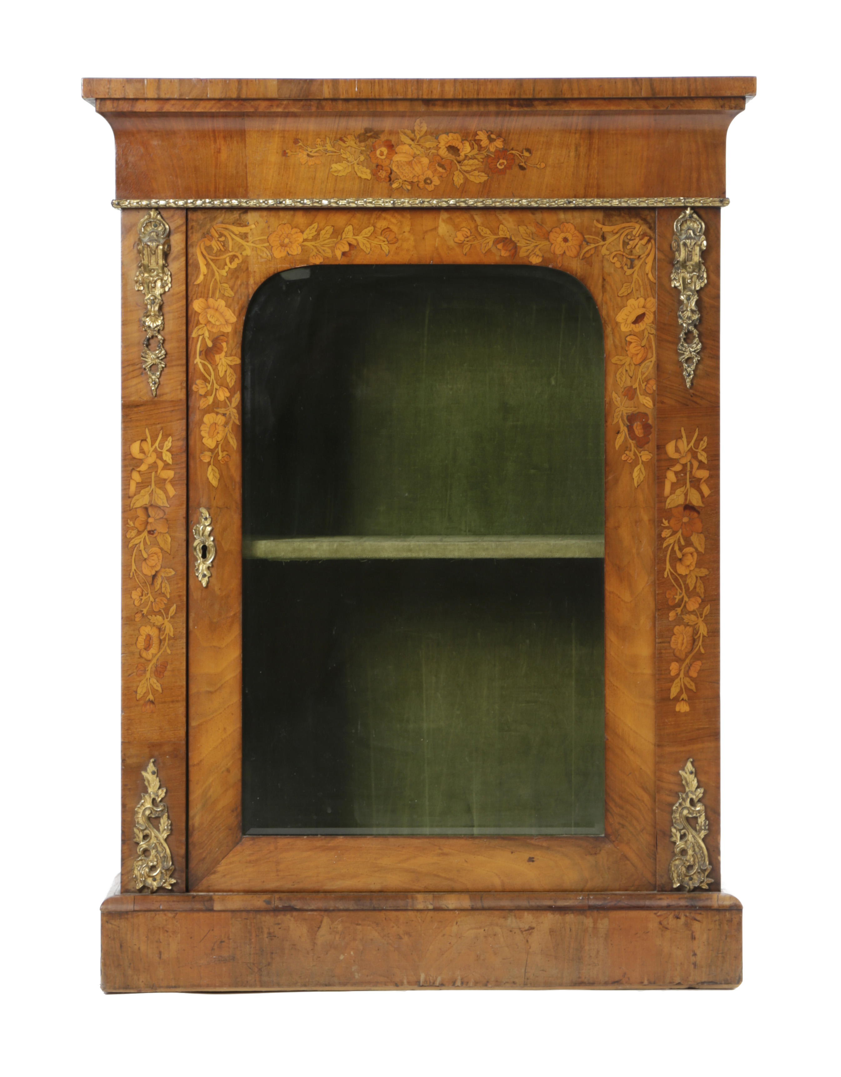 each with gilt metal mounts and inlaid with various fruitwoods with flowers, with a glazed door enclosing a plush lined interior with a shelf (2)