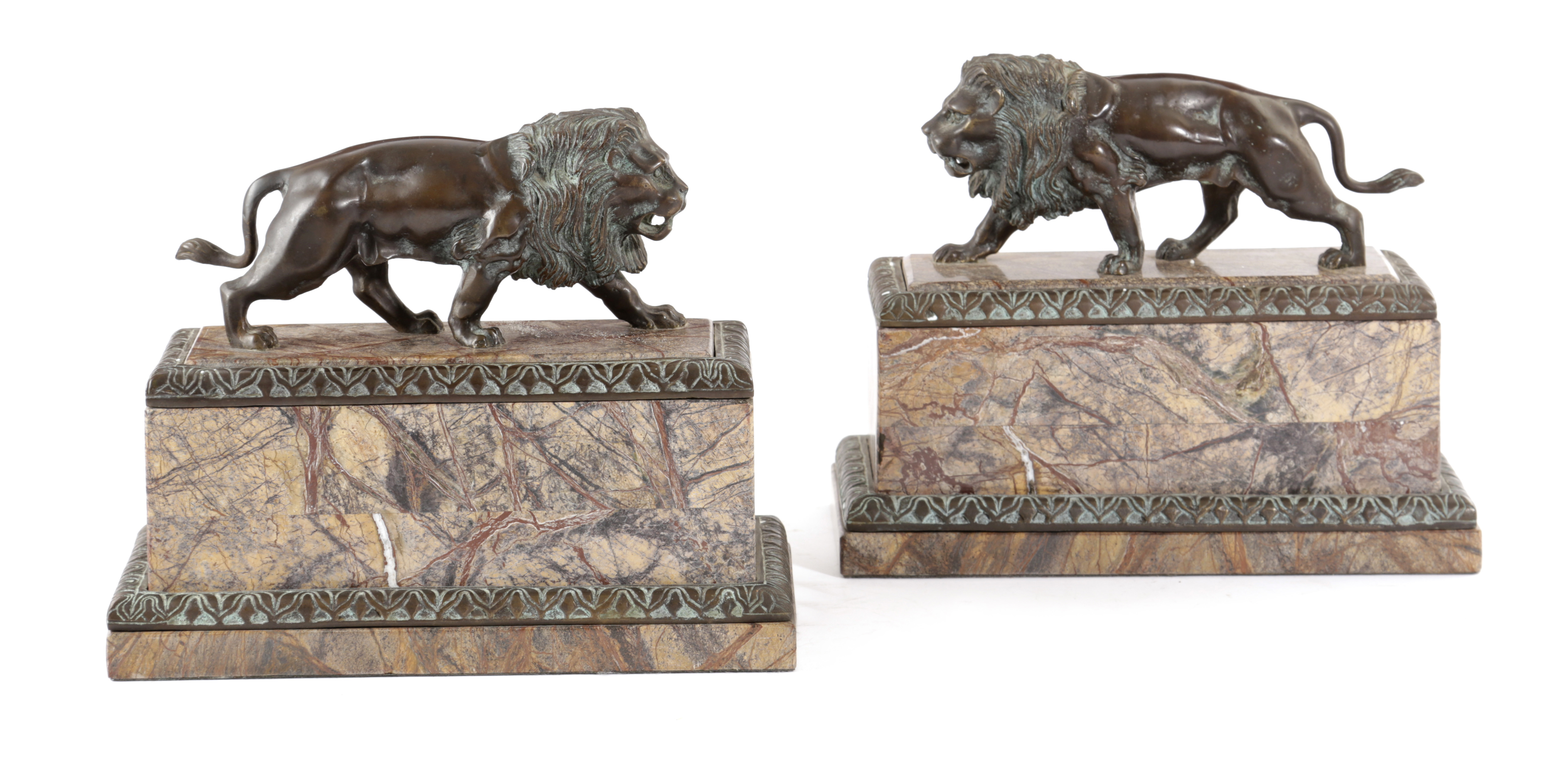 A PAIR OF BRONZE PACING LIONS