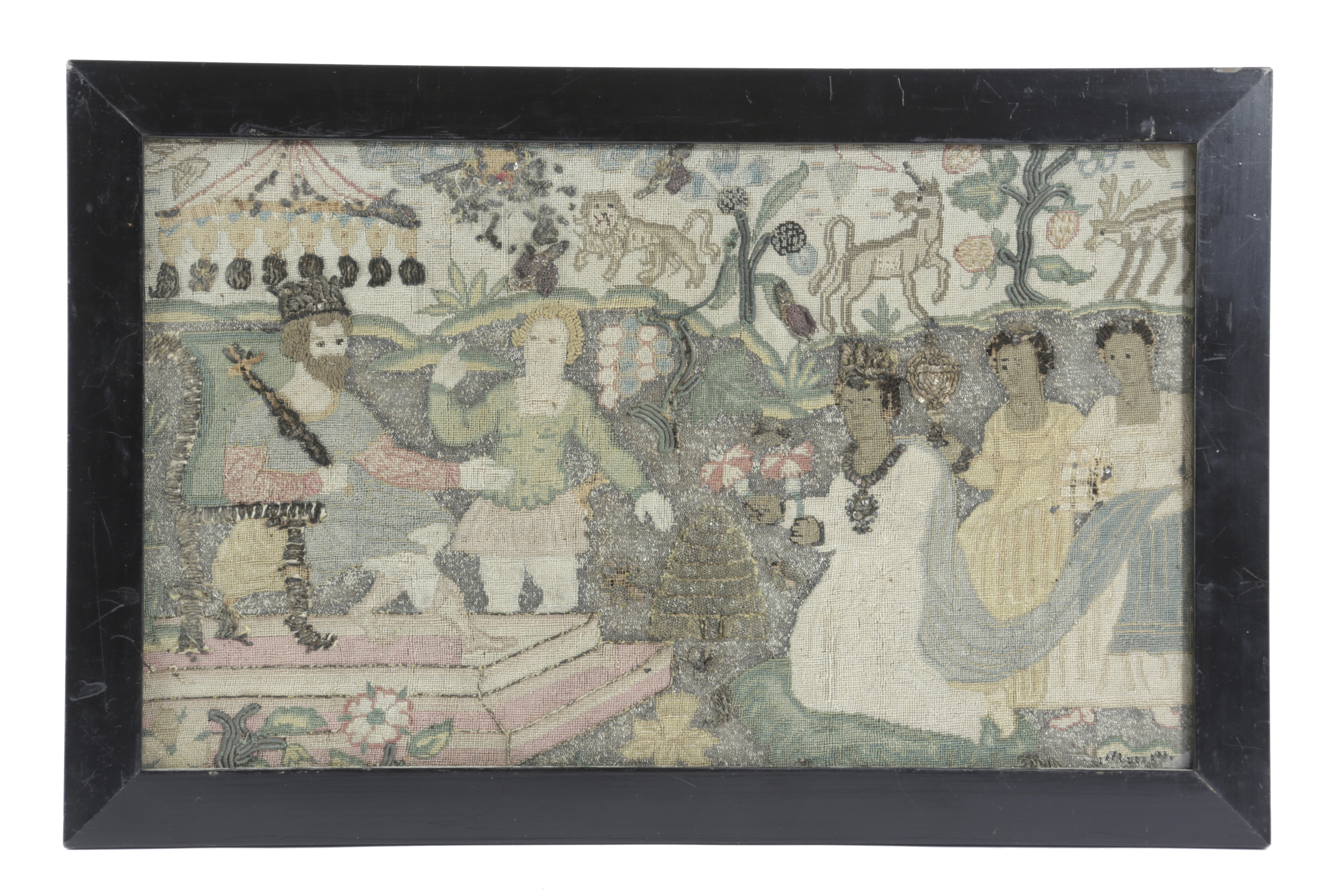 worked with silver and gold metal thread and with raised work, depicting the Biblical story of the reception of the Queen of Sheba by King Solomon, the black Queen accompanied by two ladies in waiting, the King seated on a throne under a canopy, with a lion and a unicorn in the distance, with a deer and a caterpillar, in a later glazed ebonised frame