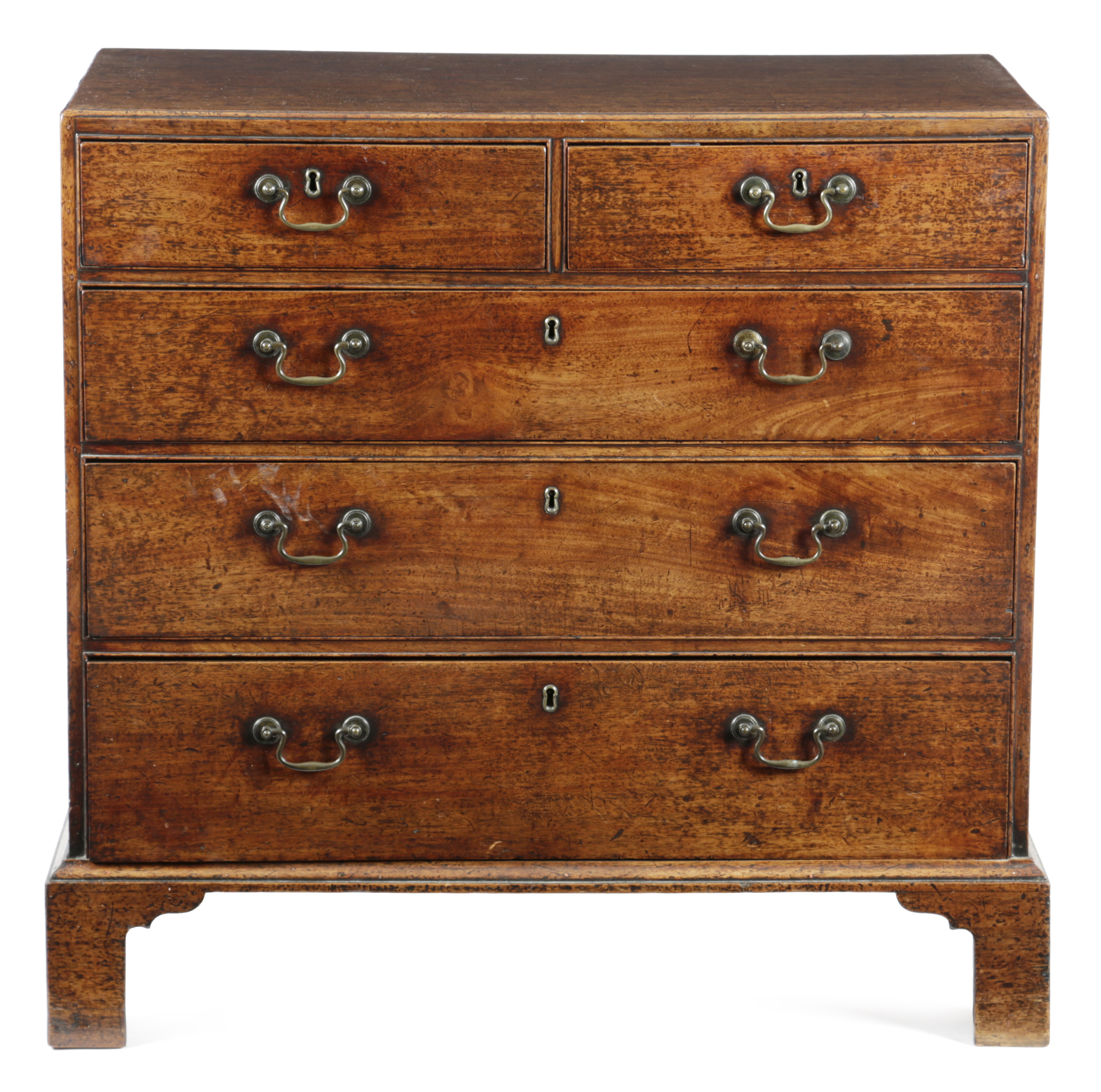 the top with a caddy moulded edge above two short and three long graduated drawers and bracket feet