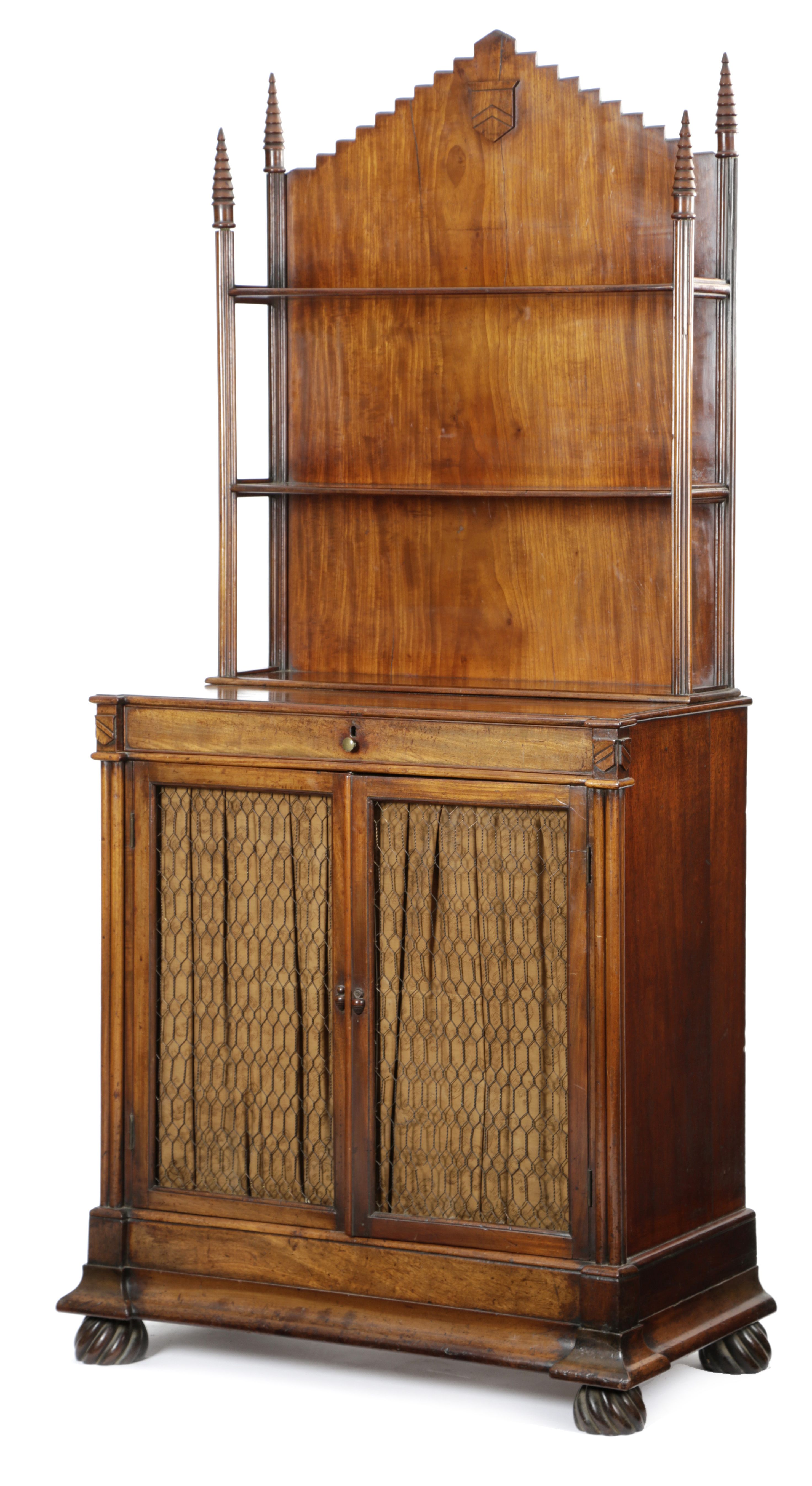 applied with shields, the top with three shelves above a frieze drawer with four divisions and stamped 'Gillows Lancaster', above a pair of pleated grille doors enclosing an interior with a shelf and two deep drawers on spiral ribbed feet