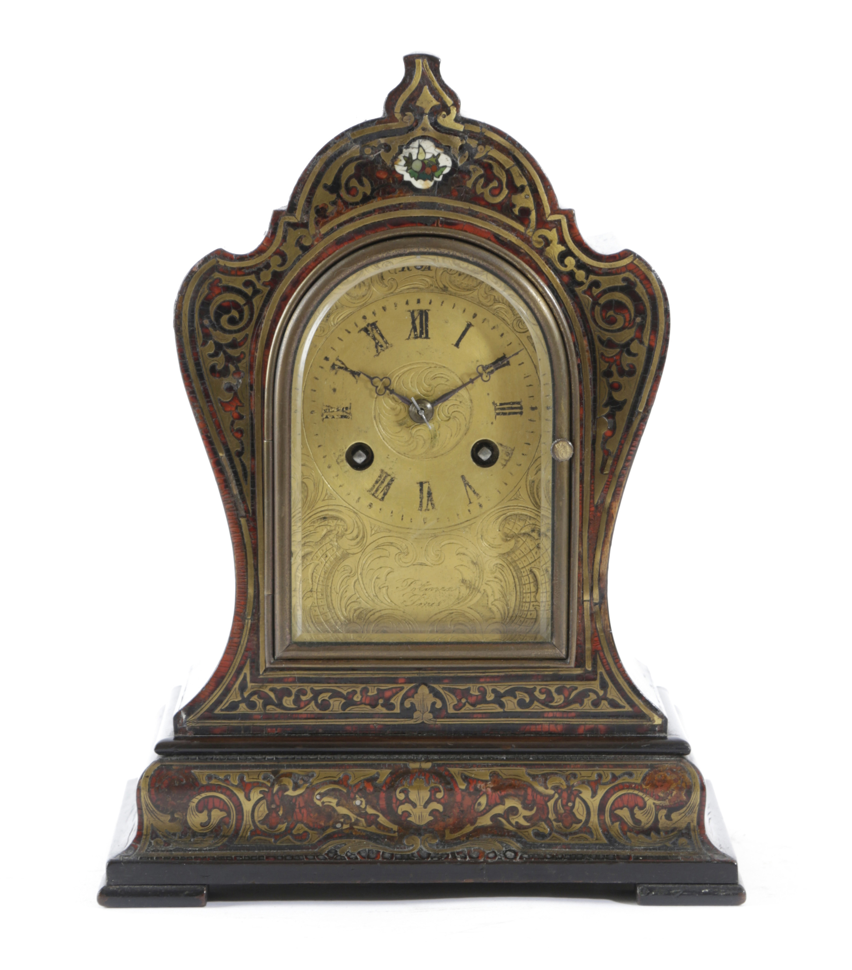 the brass eight day movement with an outside countwheel striking on a bell, stamped with maker's mark and numbered '203', the brass dial with Roman numerals above engraved decoration, signed 'Potonie, Paris', the front of the wooden case inlaid with brass and tortoiseshell