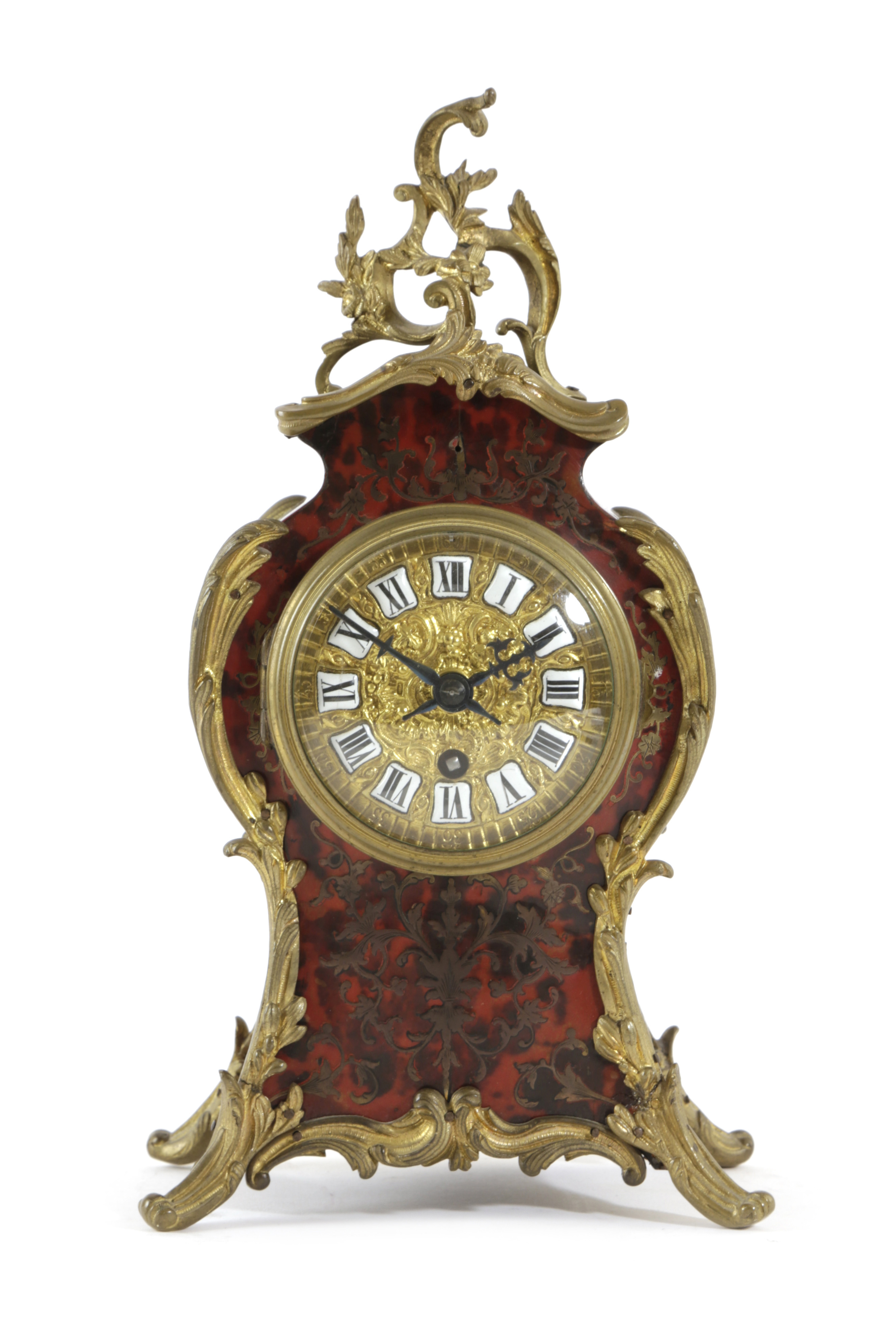 the brass eight day movement by Japy Freres, with pendulum lacking, the backplate stamped 'J. J. S 3219 44', the circular dial with Roman enamel numerals, the cartouche case with gilt metal mounts and inlaid with brass