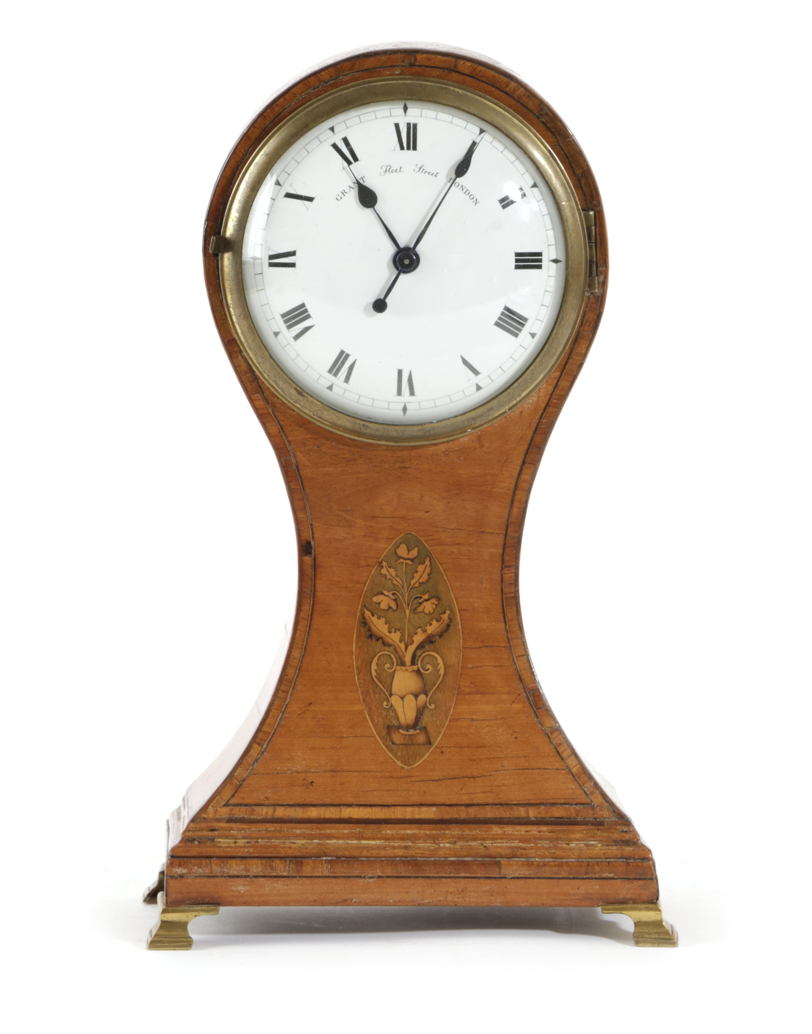 the brass movement with a platform lever escapement, the circular enamel dial with Roman numerals and signed 'Grant, Fleet Street, London', the case inlaid with a marquetry urn of flowers