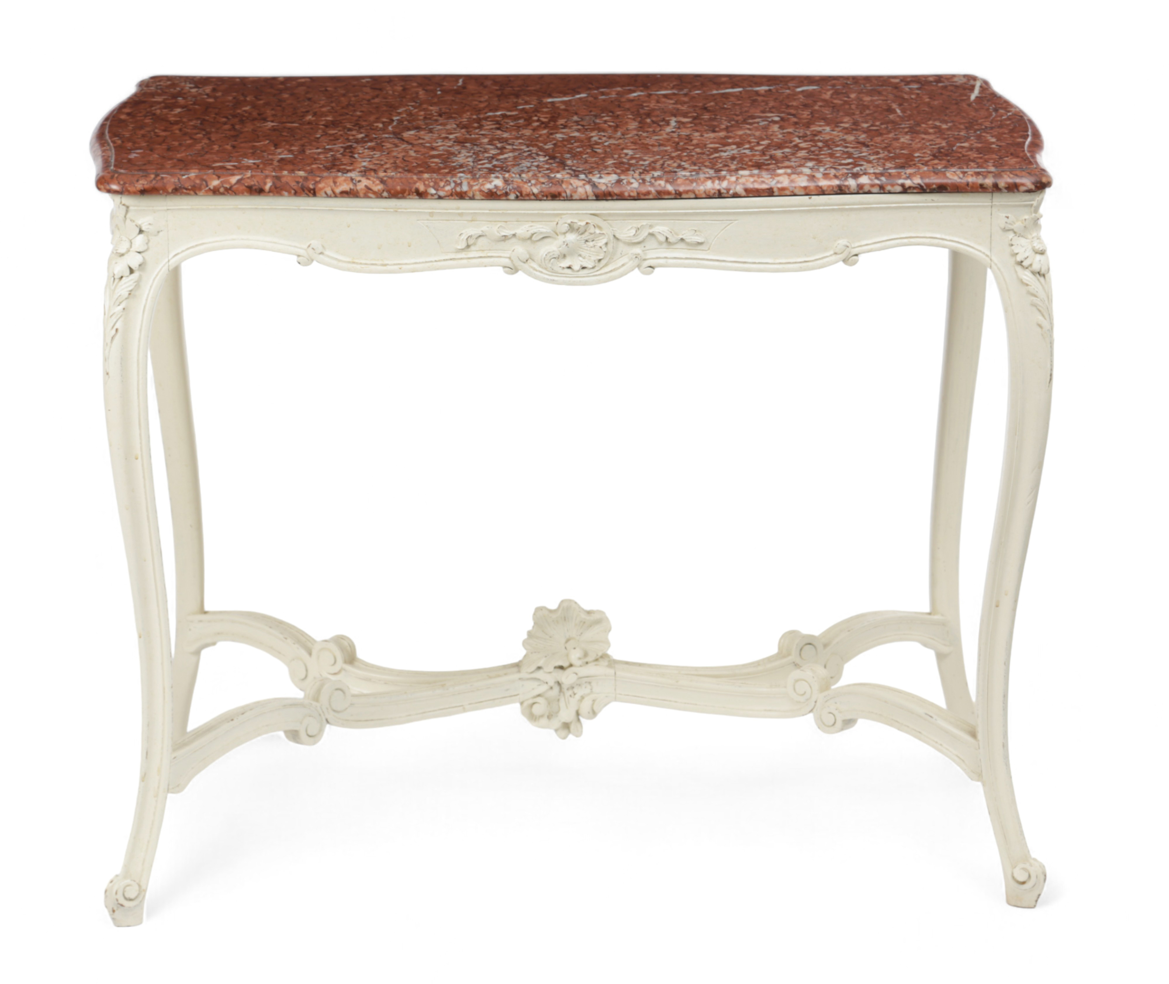 the serpentine rouge griotte marble top above cabriole legs united by a 'C' scroll stretcher