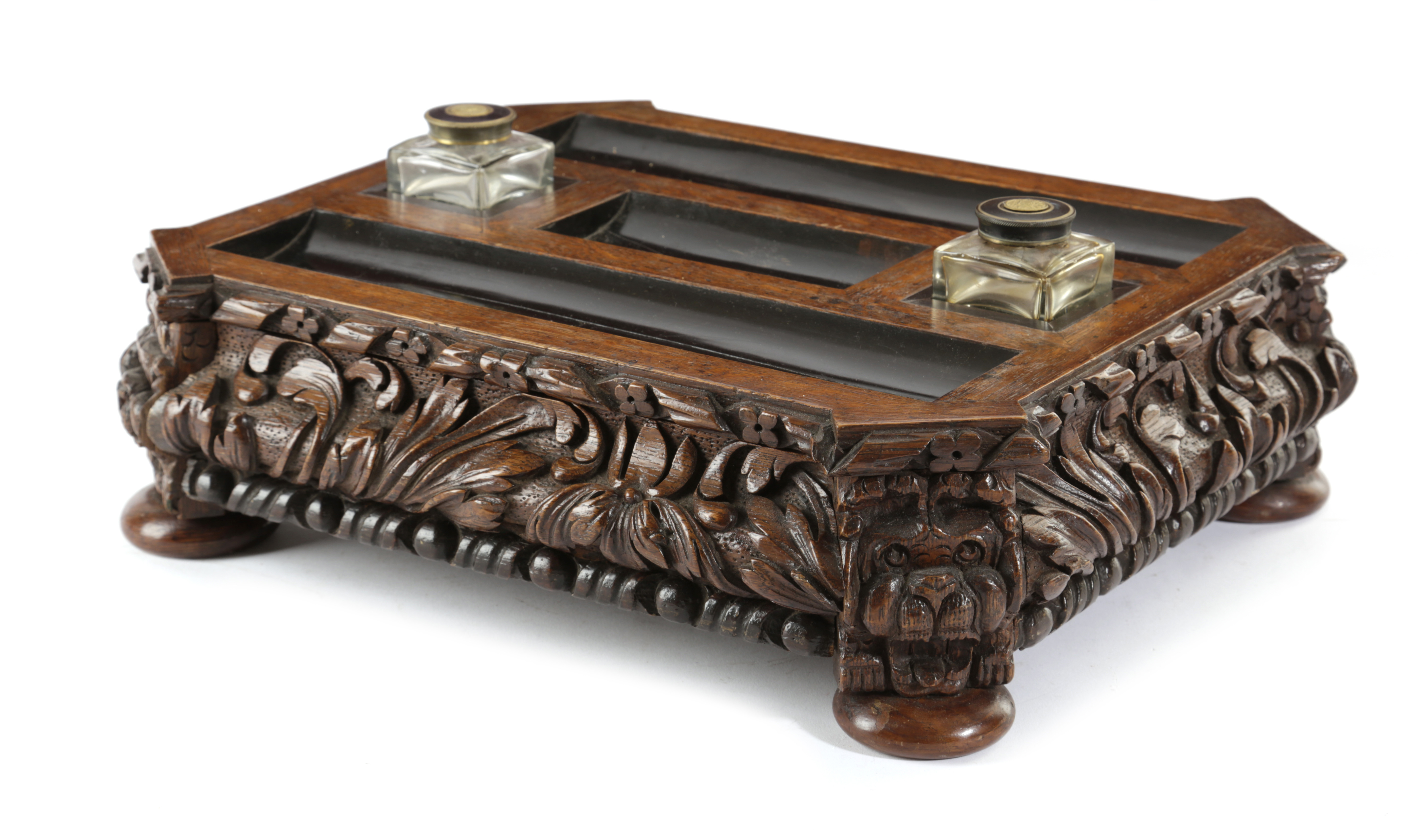 carved with leaves, ribbons and florets and the corners with stylised dogs, with three ebonised dipped recesses and a pair of glass inkwells, the brass lids stamped 'Patent London' above a drawer