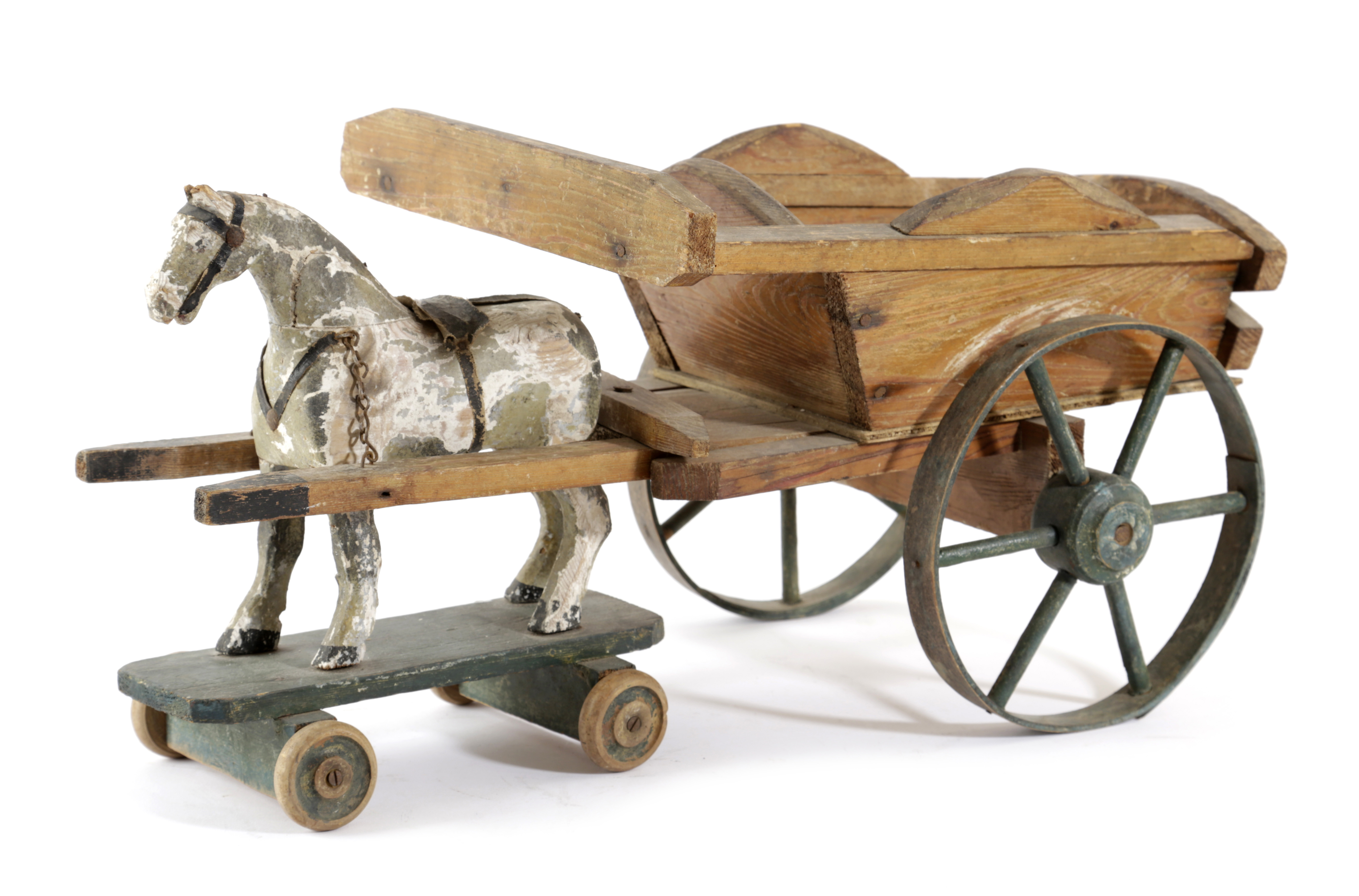 A FOLK ART PAINTED WOOD PULL-ALONG TOY HORSE AND CART