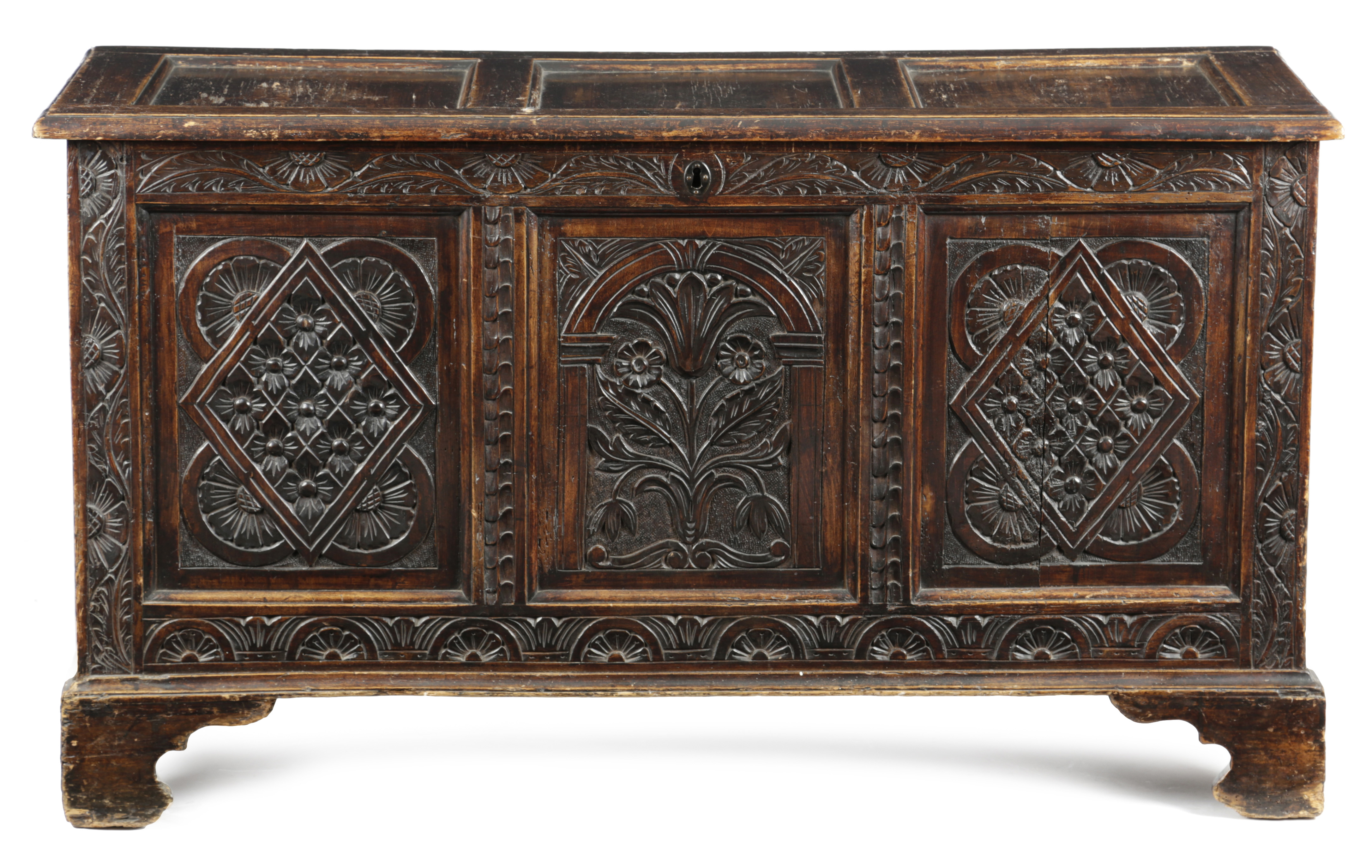 A FRUITWOOD TRIPLE PANELLED COFFER