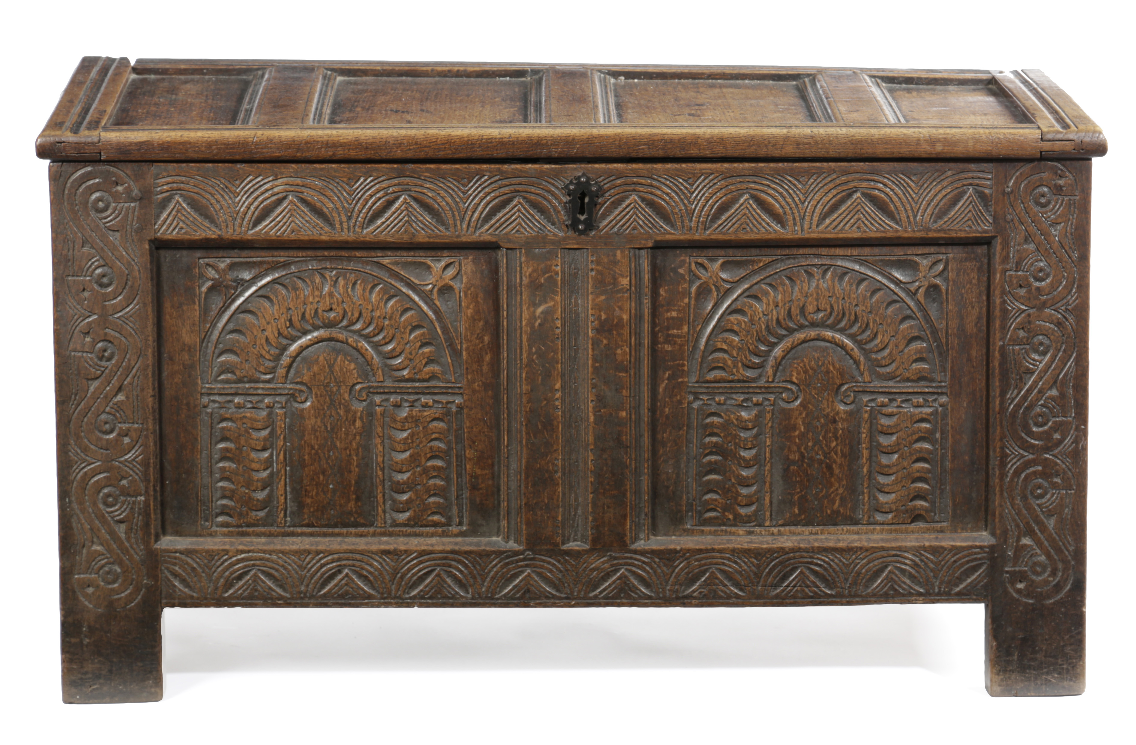 the panelled later hinged top revealing an interior with a lidded till, the front with twin panels of arches with stylised 'S' decoration