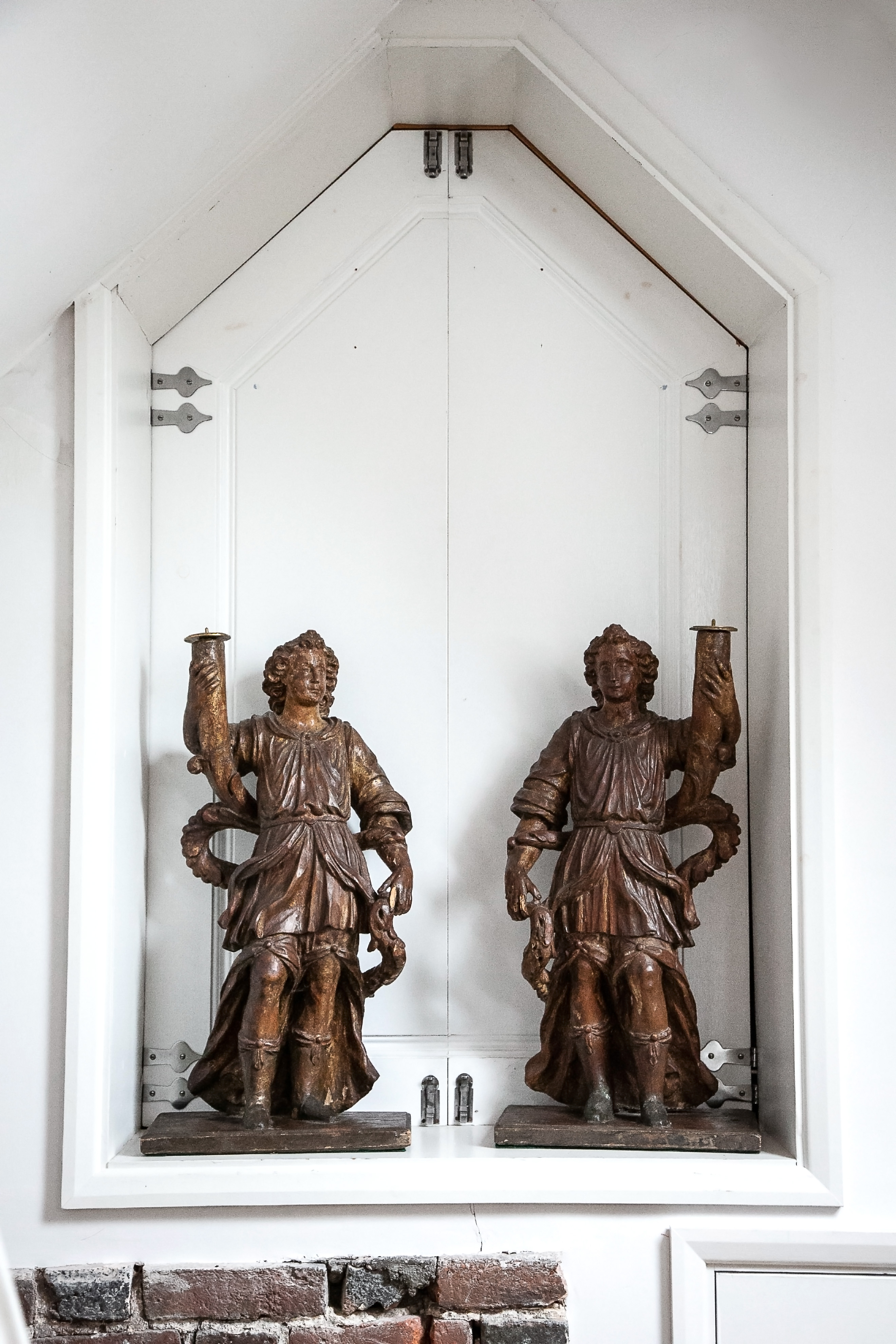 possibly depicting the Lares the mythological sons of Mercurius, each figure with traces of gilding and modelled holding a cornucopia, mounted on a later pine base (2)
