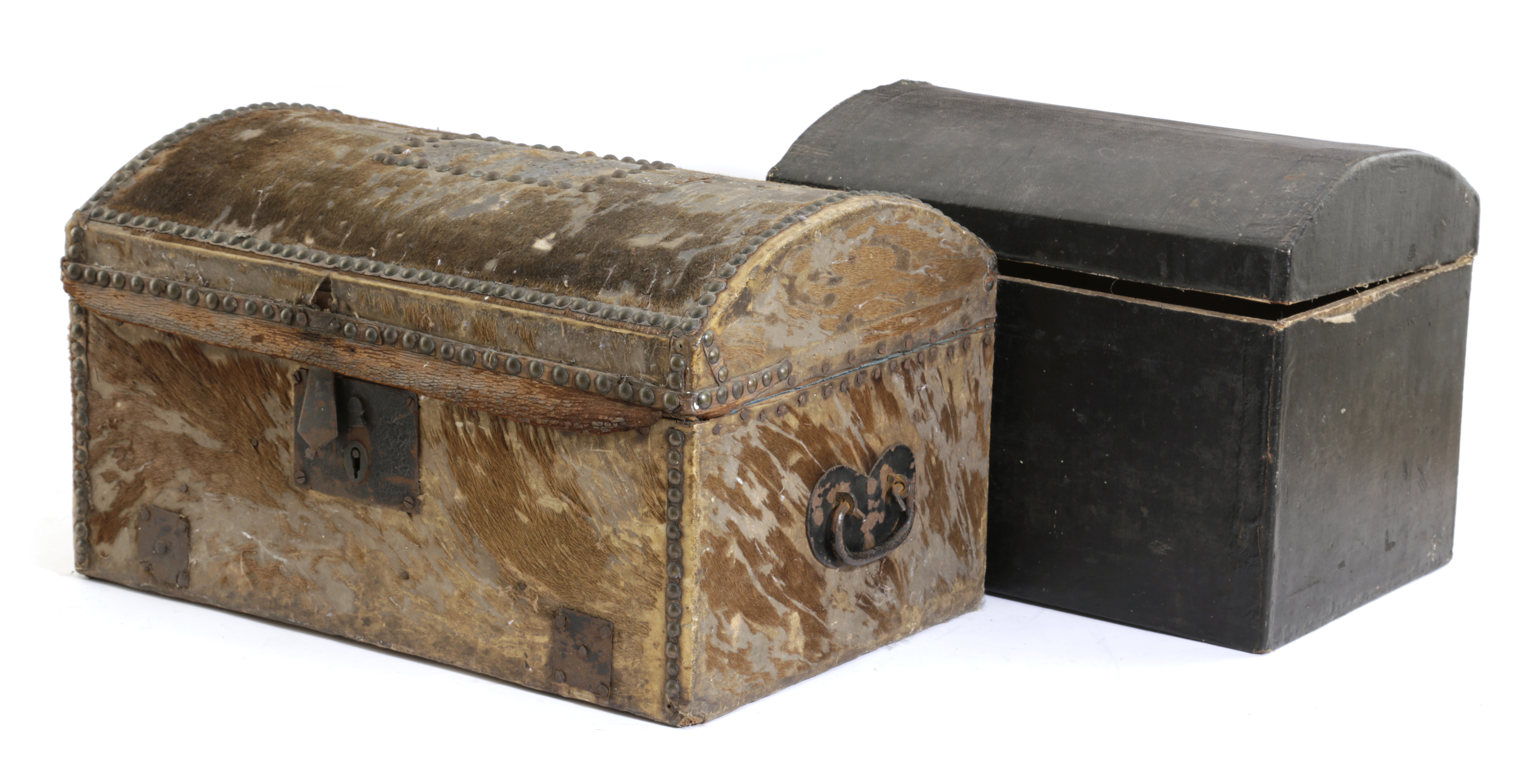 with brass studded decoration the interior with blue paper lining with side carrying handles, together with another domed trunk the interior with a tray (2)