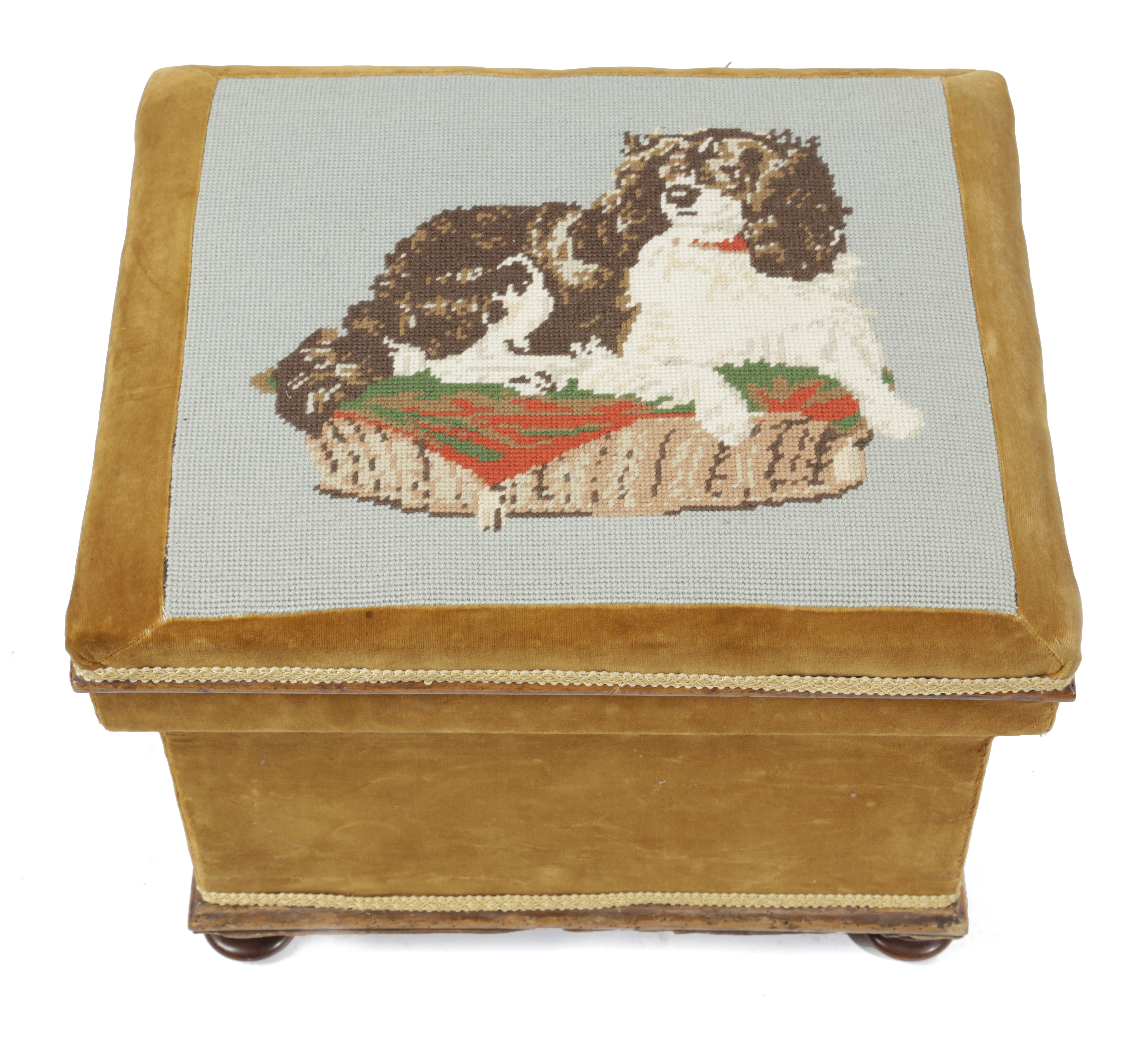 the hinged lid with a needlework panel of a recumbent spaniel on a cushion