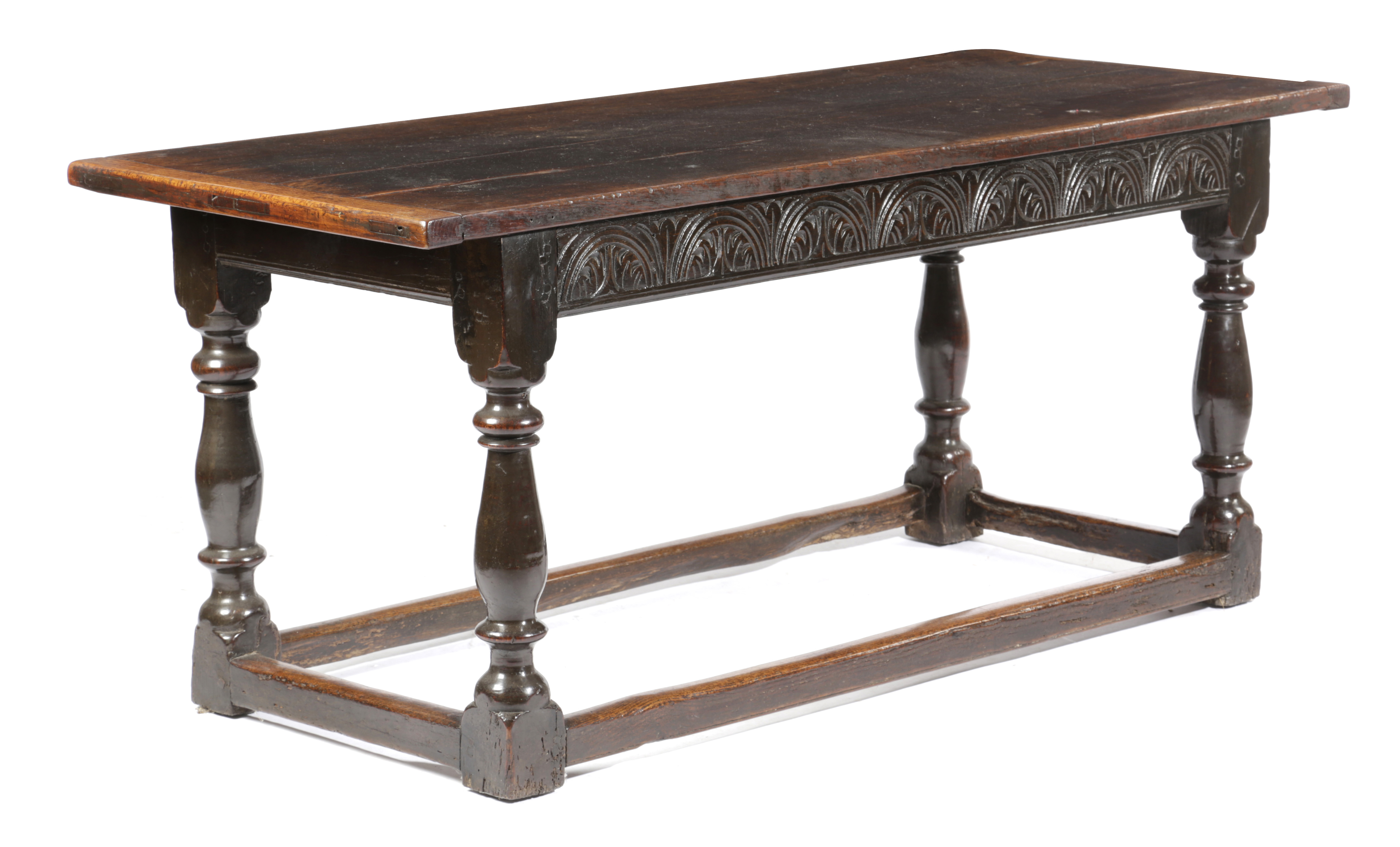 the twin plank top with cleated ends above a leaf carved lunette front frieze on baluster turned legs united by peripheral stretchers
