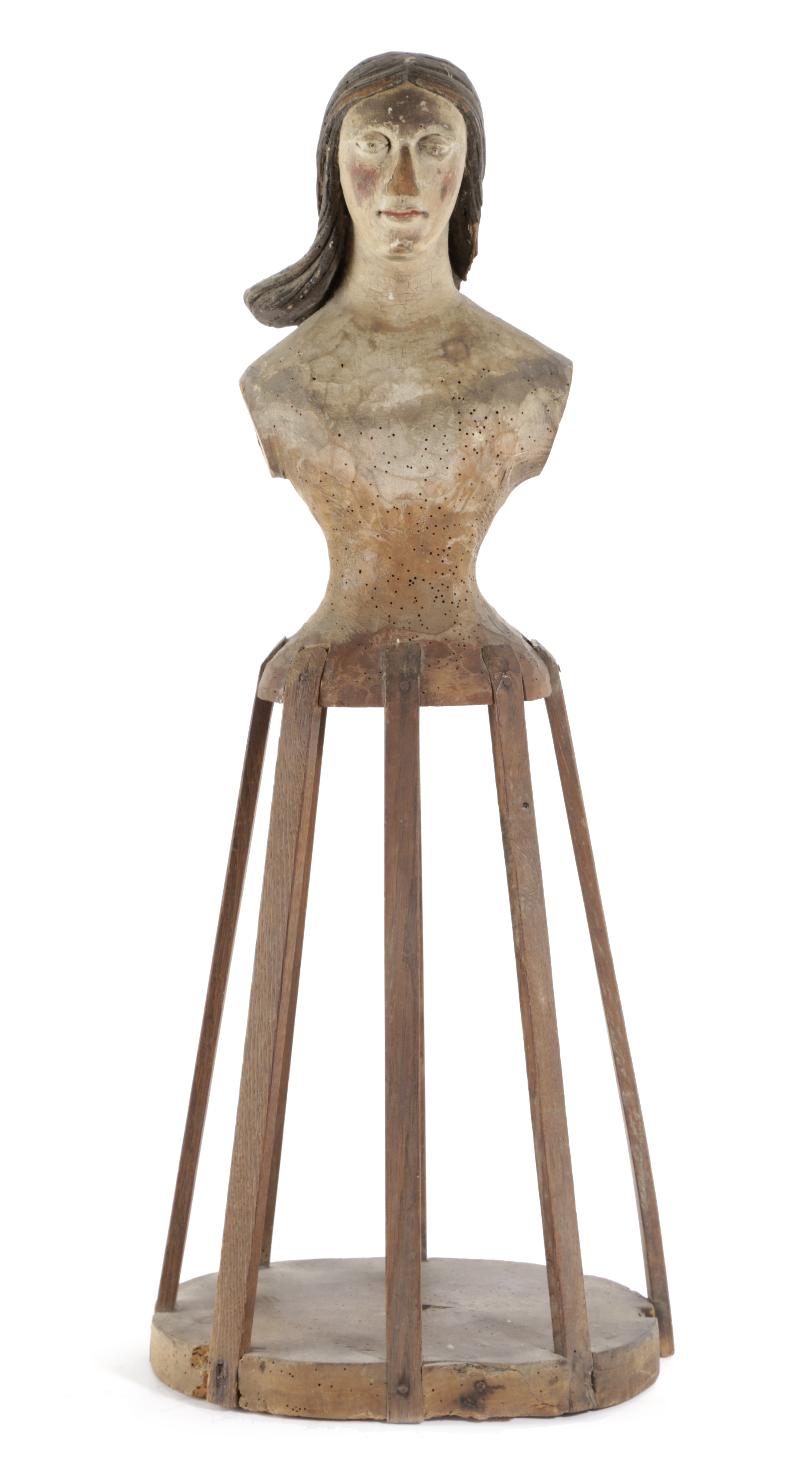 the carved wooden bust with flowing hair and polychrome decoration, on an openwork frame, the oval base with a central hole for fitting on to a carrying pole