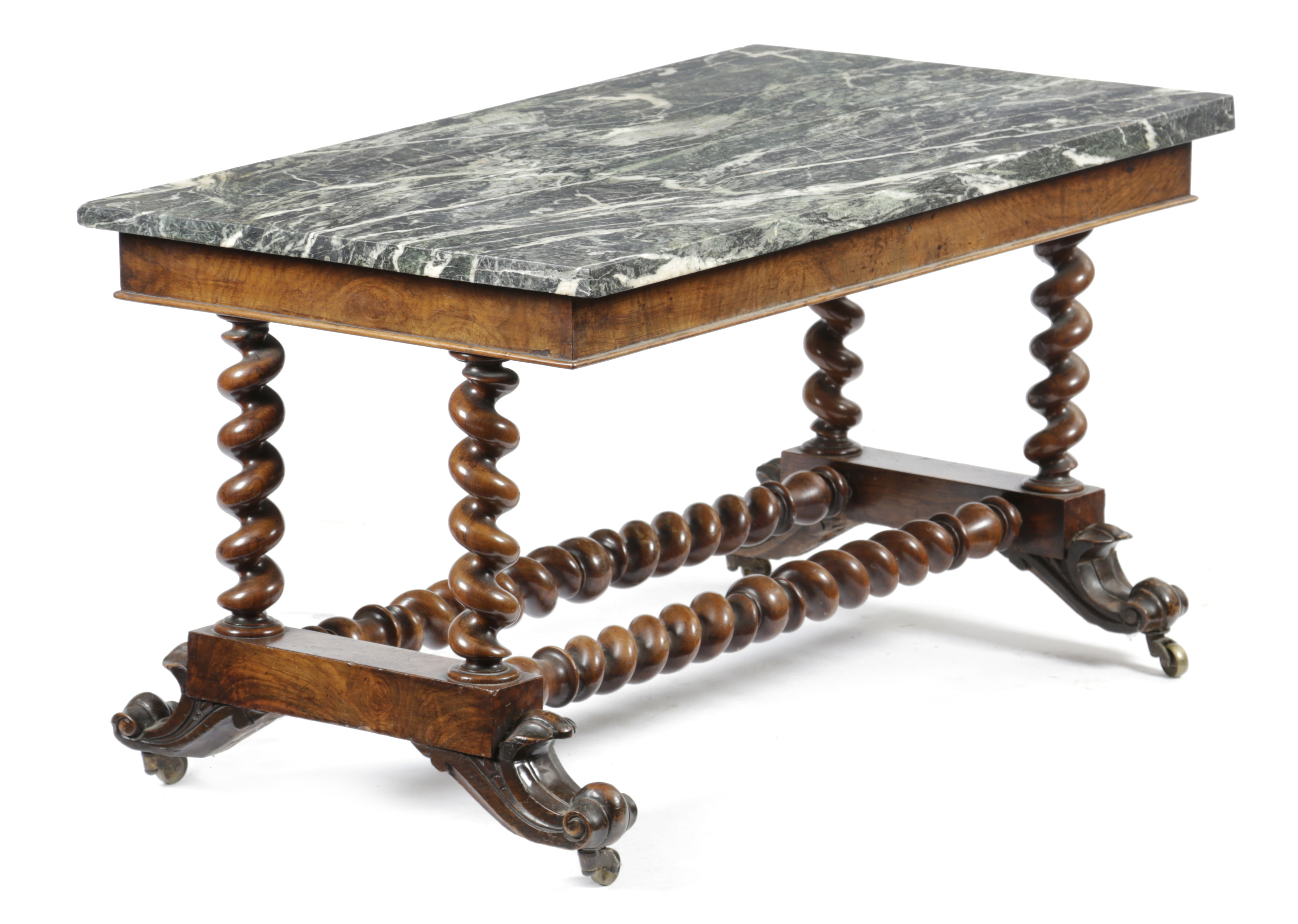 the rectangular top on spiral twist supports and scroll feet and brass castors