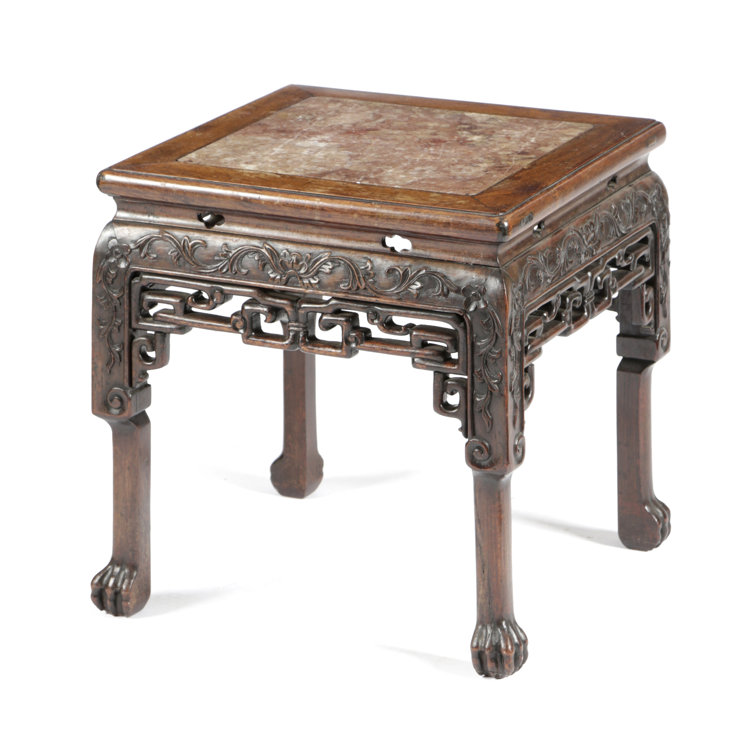 the top inset with a marble panel above a leaf and flower carved pierced frieze on claw and ball feet