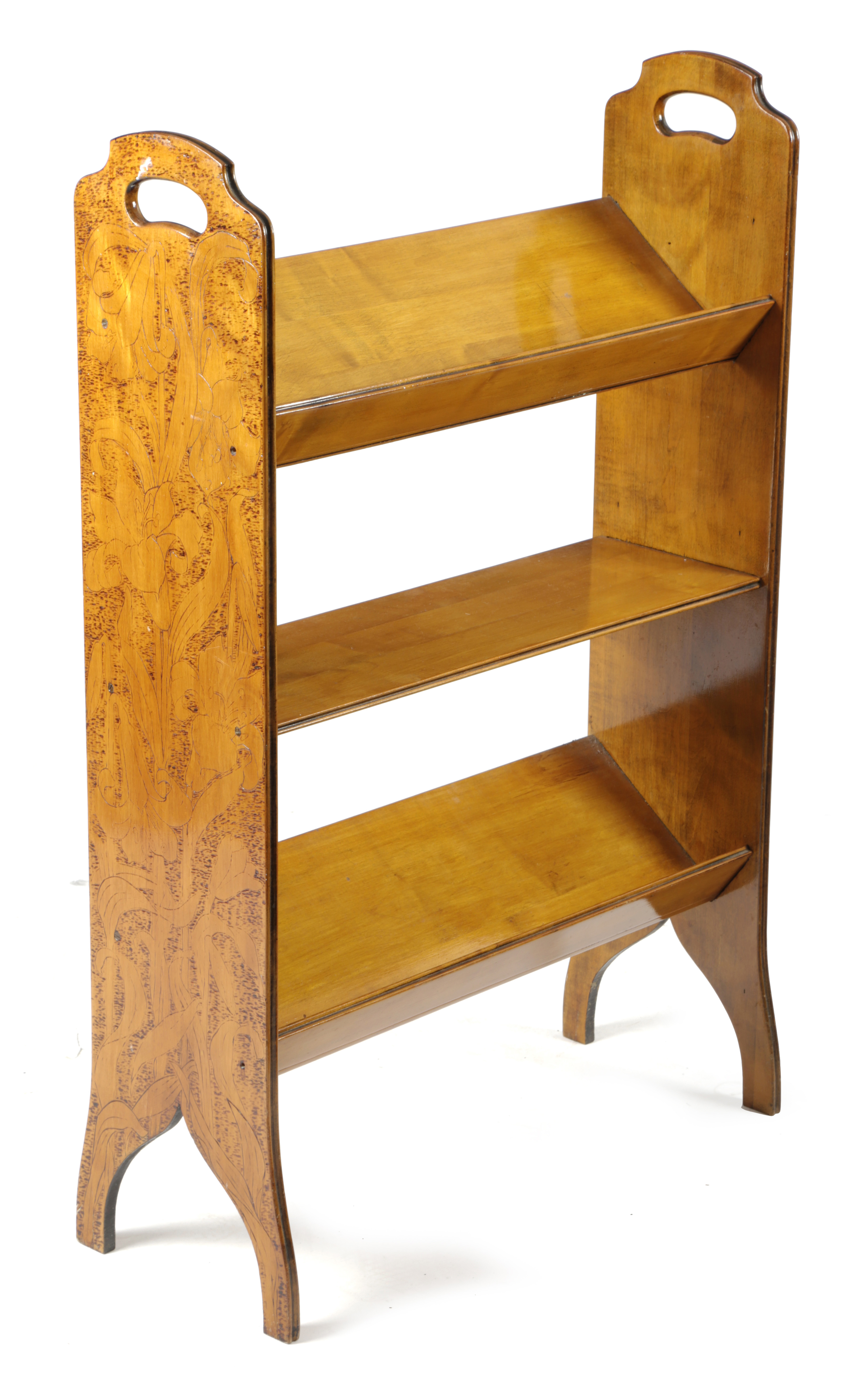 A LATE VICTORIAN SATIN BIRCH AND POKERWORK FREESTANDING BOOKSHELF