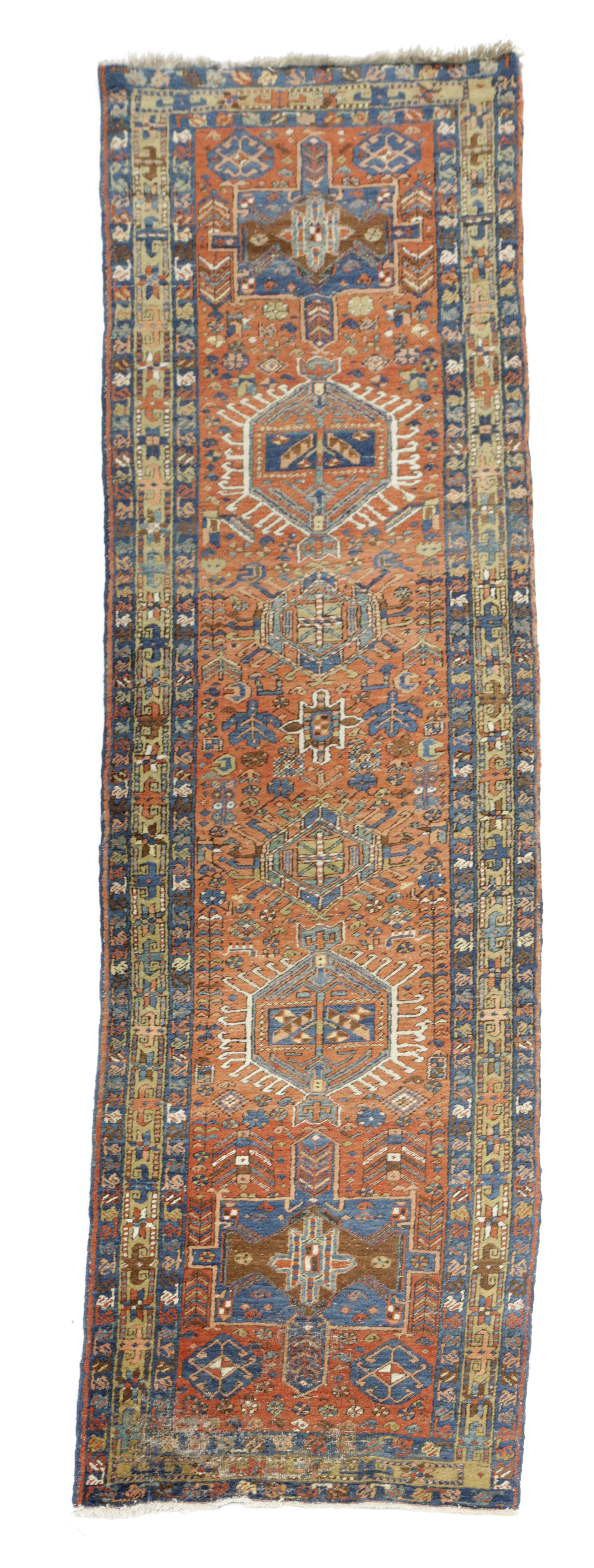 the terracotta field with a column of latch hook and cruciform medallions surrounded by stylised plants and flowerheads enclosed by pale lemon borders of angular vines and similar indigo guard stripes