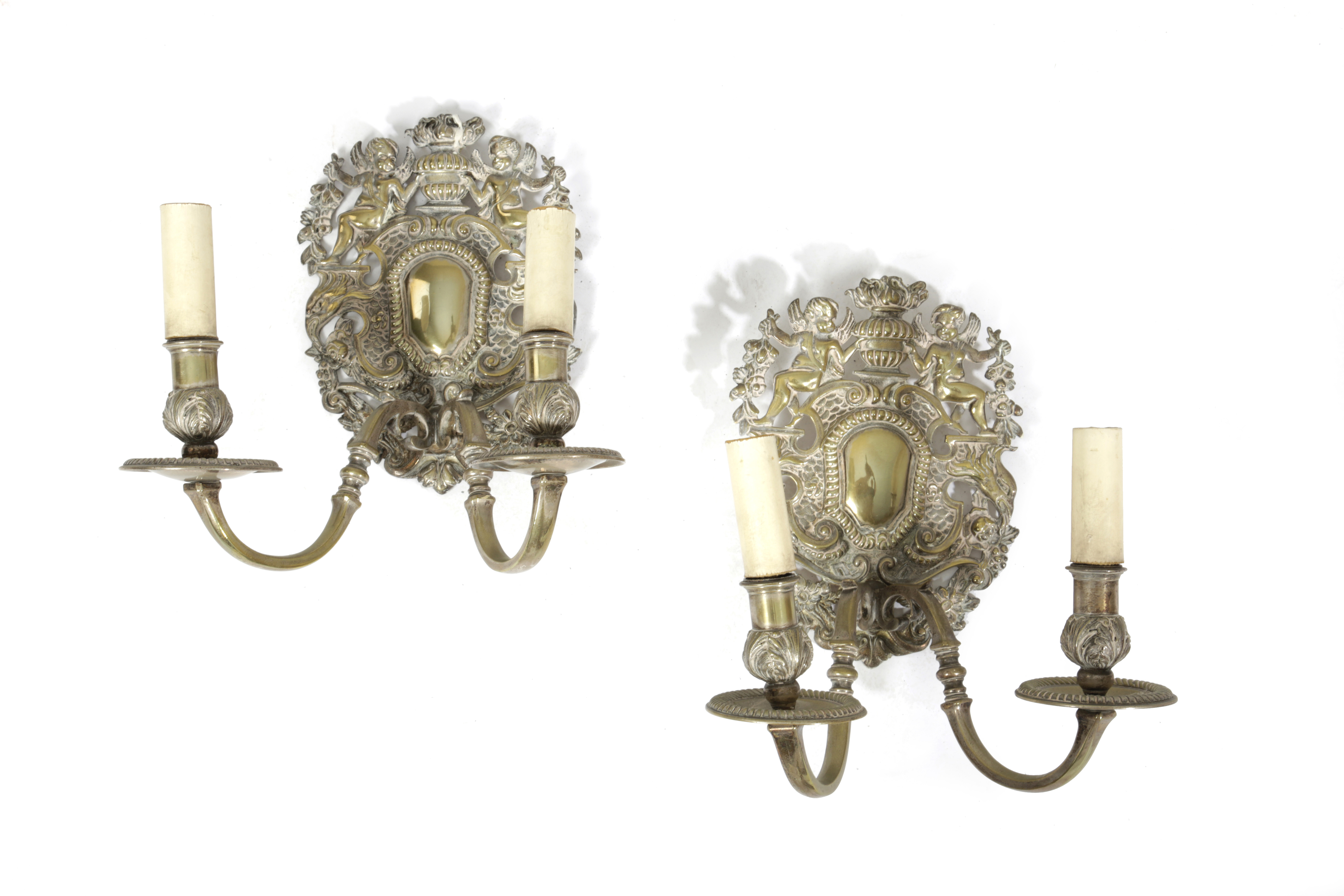 each decorated with winged cherubs supporting a flaming urn, fitted for electricity (2)