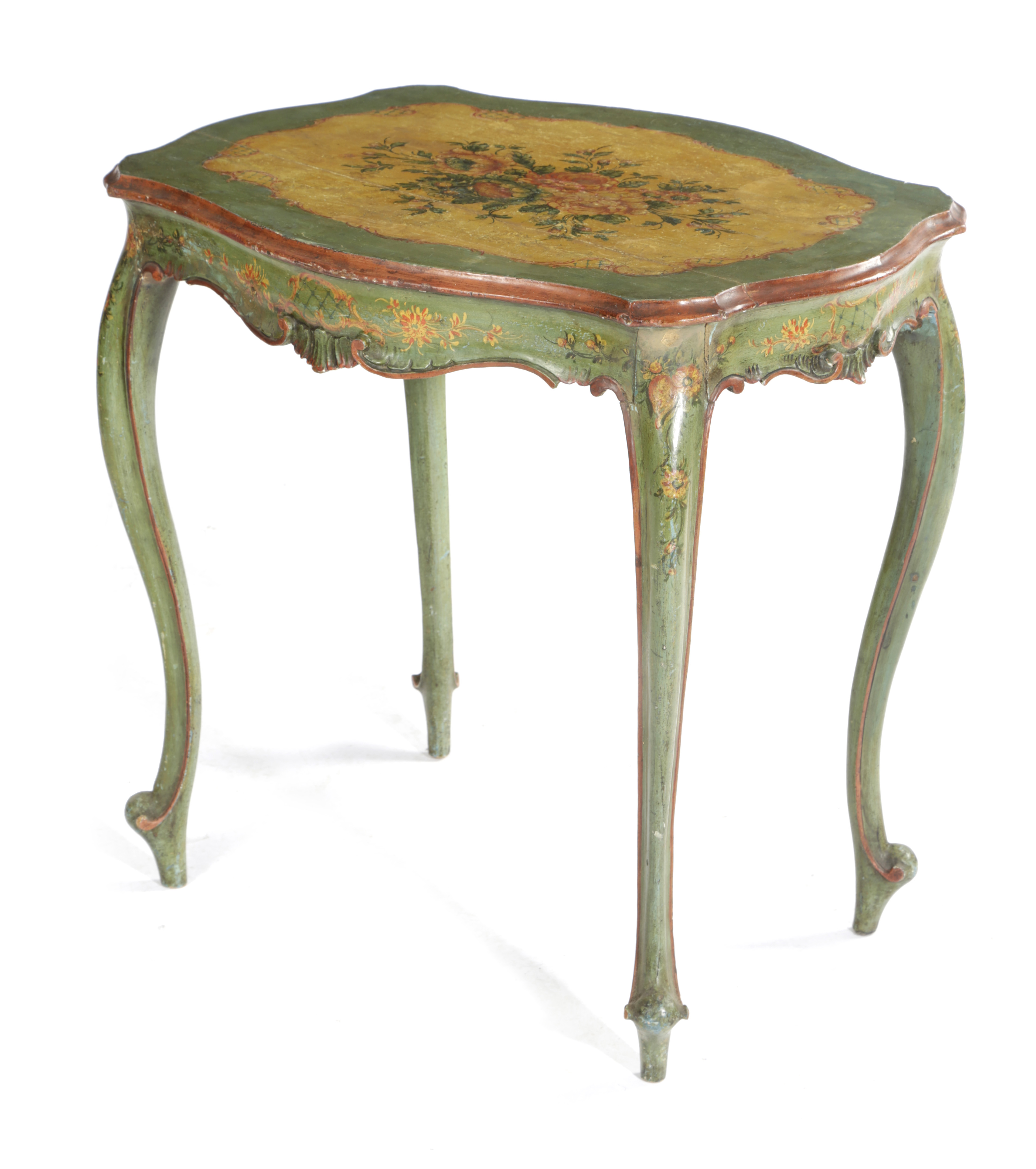 the serpentine top painted with a panel of flowers, with a scroll and lattice decorated frieze and on cabriole legs