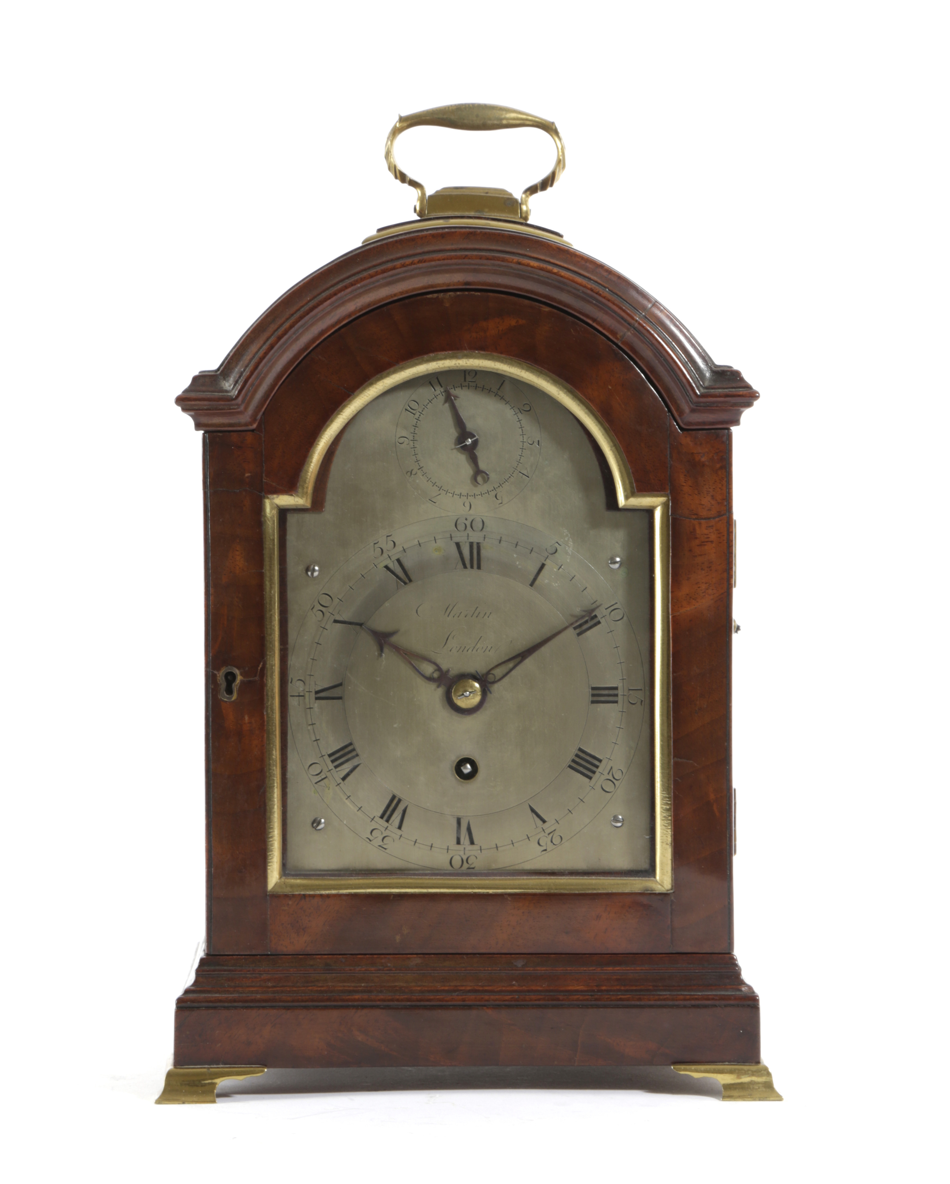 A GEORGE III MAHOGANY AND BRASS MOUNTED MANTEL CLOCK