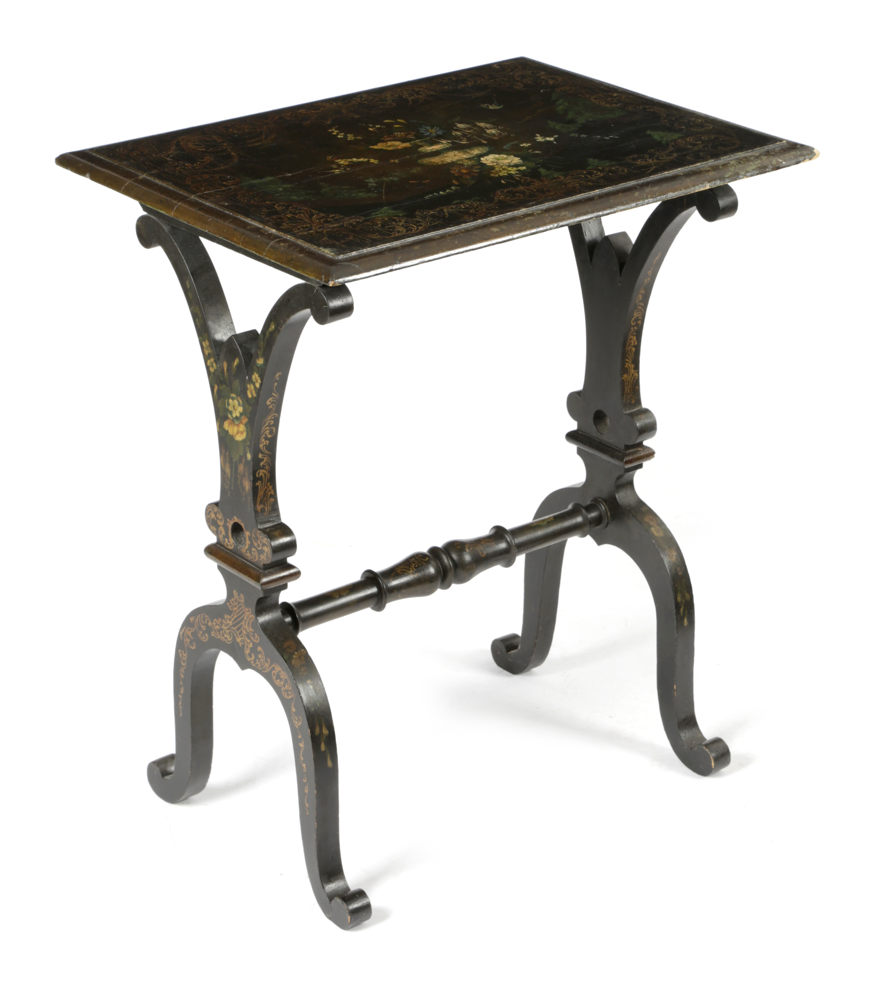 A VICTORIAN EBONISED AND PAINTED OCCASIONAL TABLE
