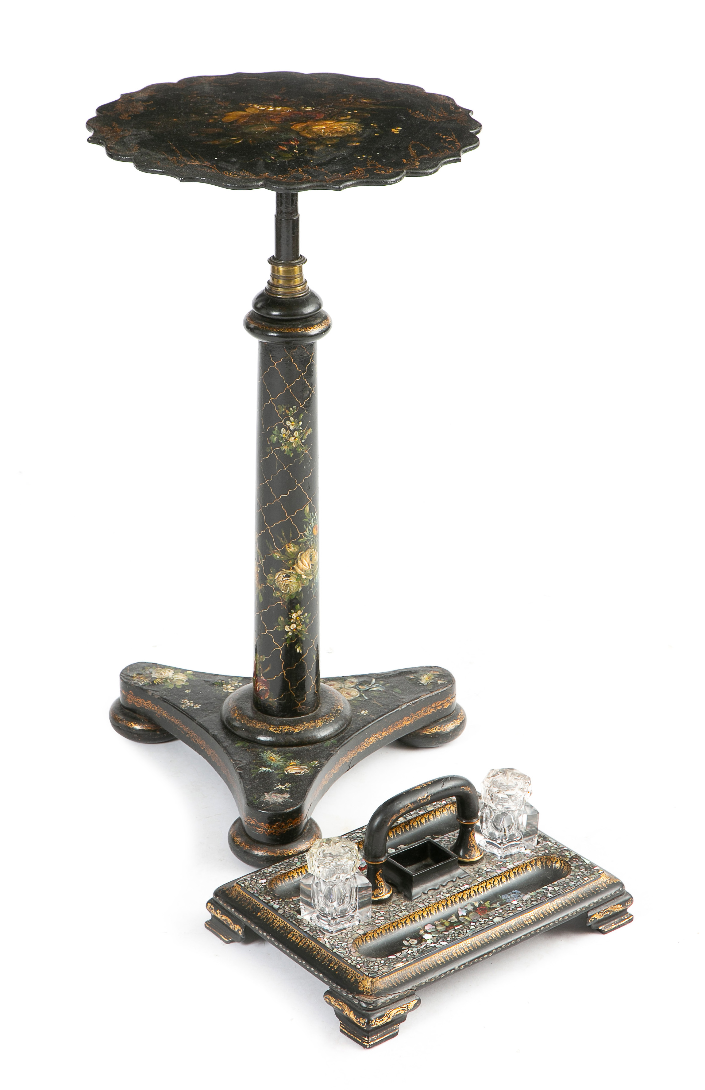 painted with flowers and with gilt highlights, the fixed top on a turned stem and triform base, stamped 'Jennens & Bettridge, London, Birmingham', formerly a pole firescreen later converted, together with a papier-mâché desk stand with glass inkwells (2)