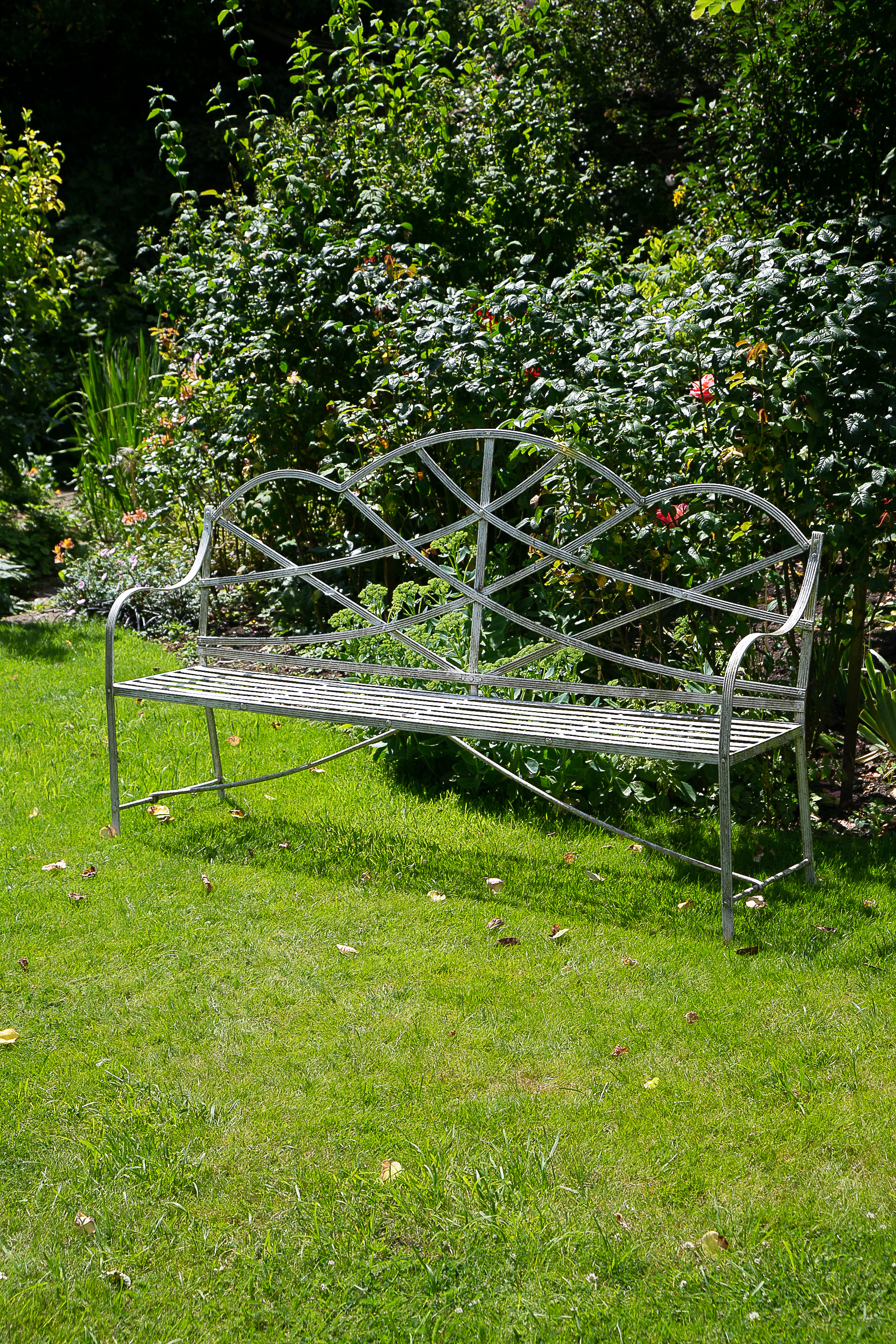 with an arching back above a slatted seat