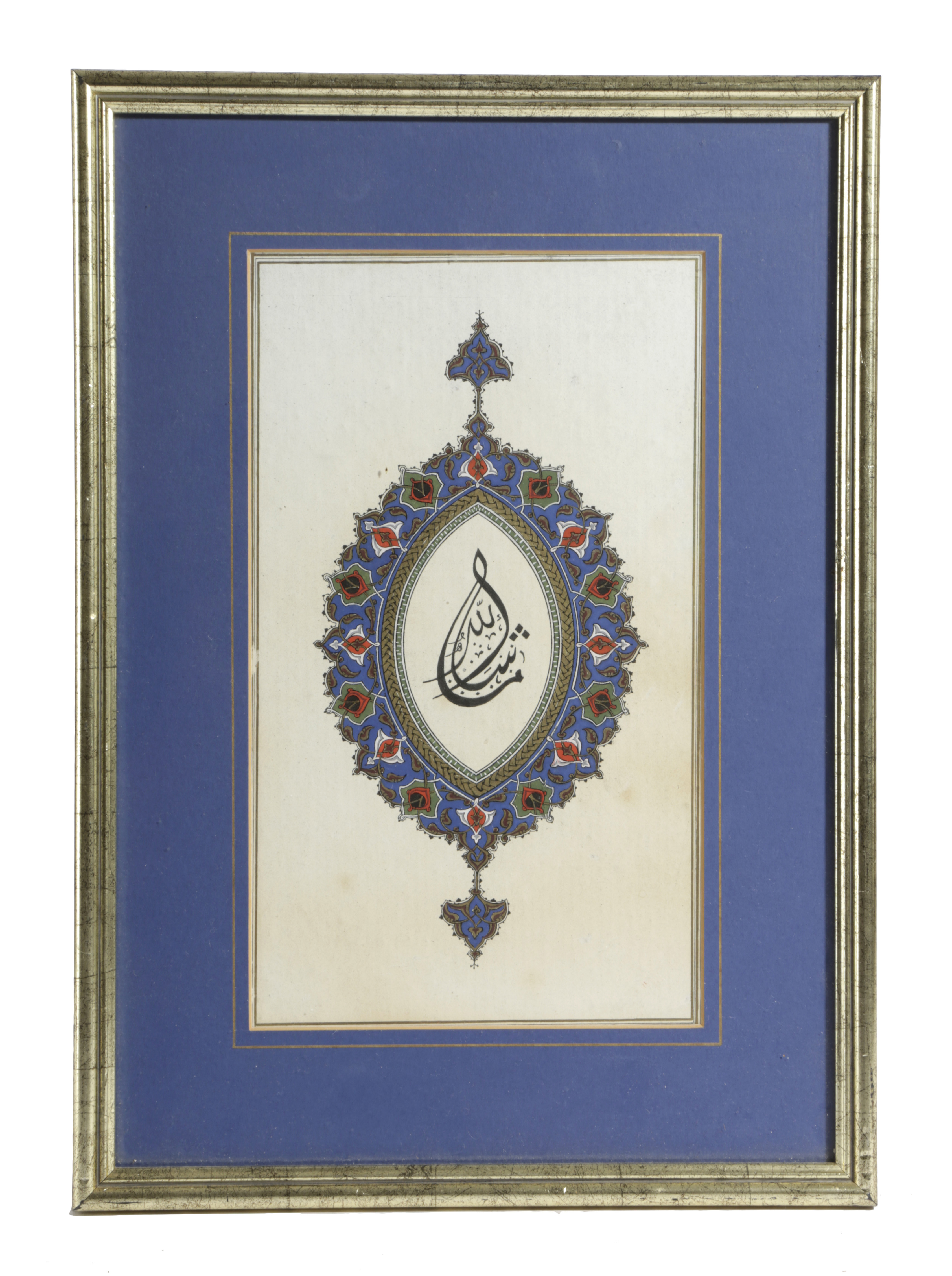 the oval design with a central Arabic character inside a painted and gilded foliate border, framed