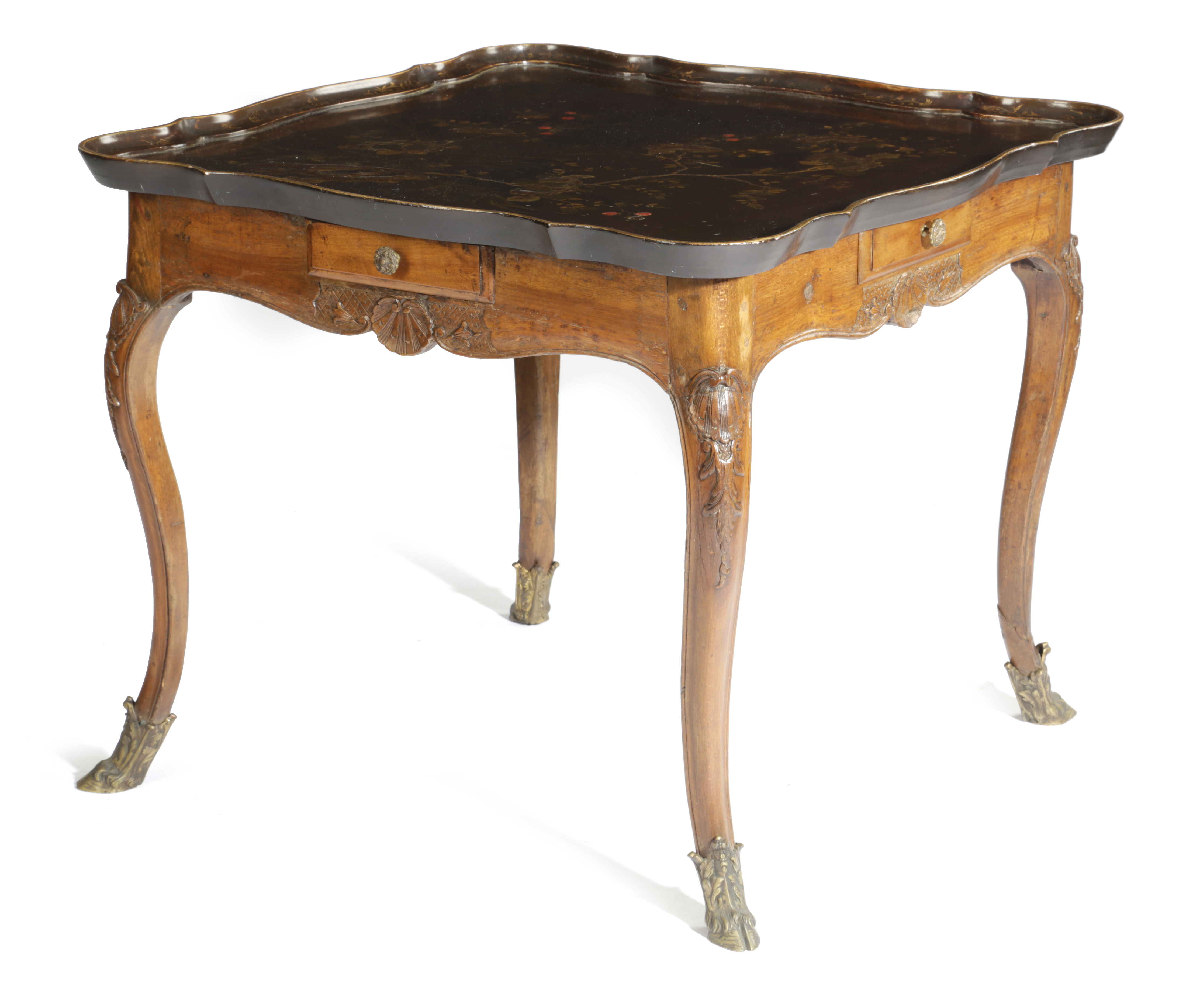 A FRENCH WALNUT, BEECH AND JAPANNED TRAY-TOP TABLE