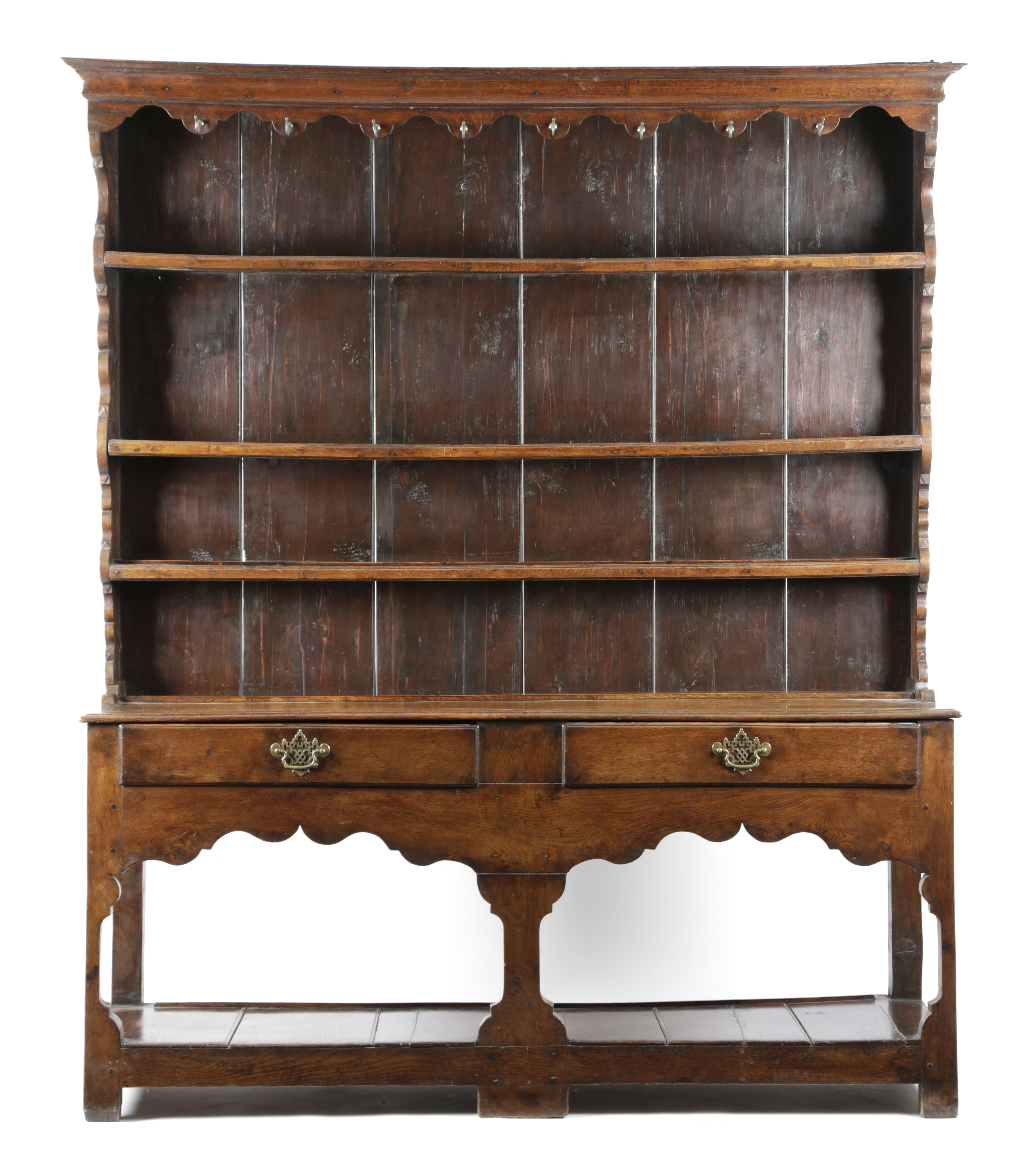 the plate rack with three shelves above a pair of frieze drawers and a potboard base