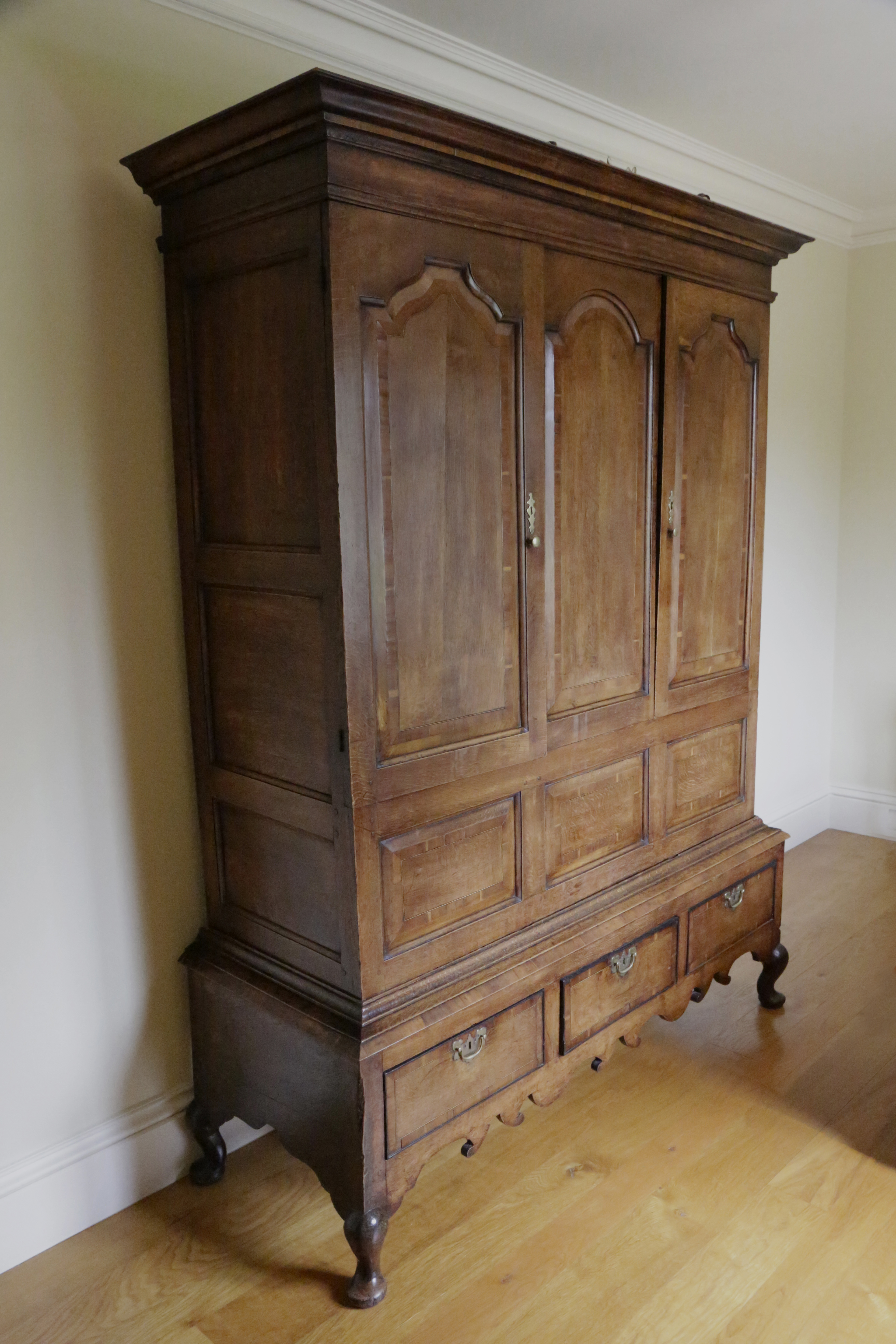 with cherrywood banding and inlaid with ebony and boxwood stringing, the moulded cornice above a pair of ogee arch panelled doors flanking a rounded arch panel above three rectangular fielded panels, the base with three short drawers above a wavy apron and short cabriole legs with pad feet