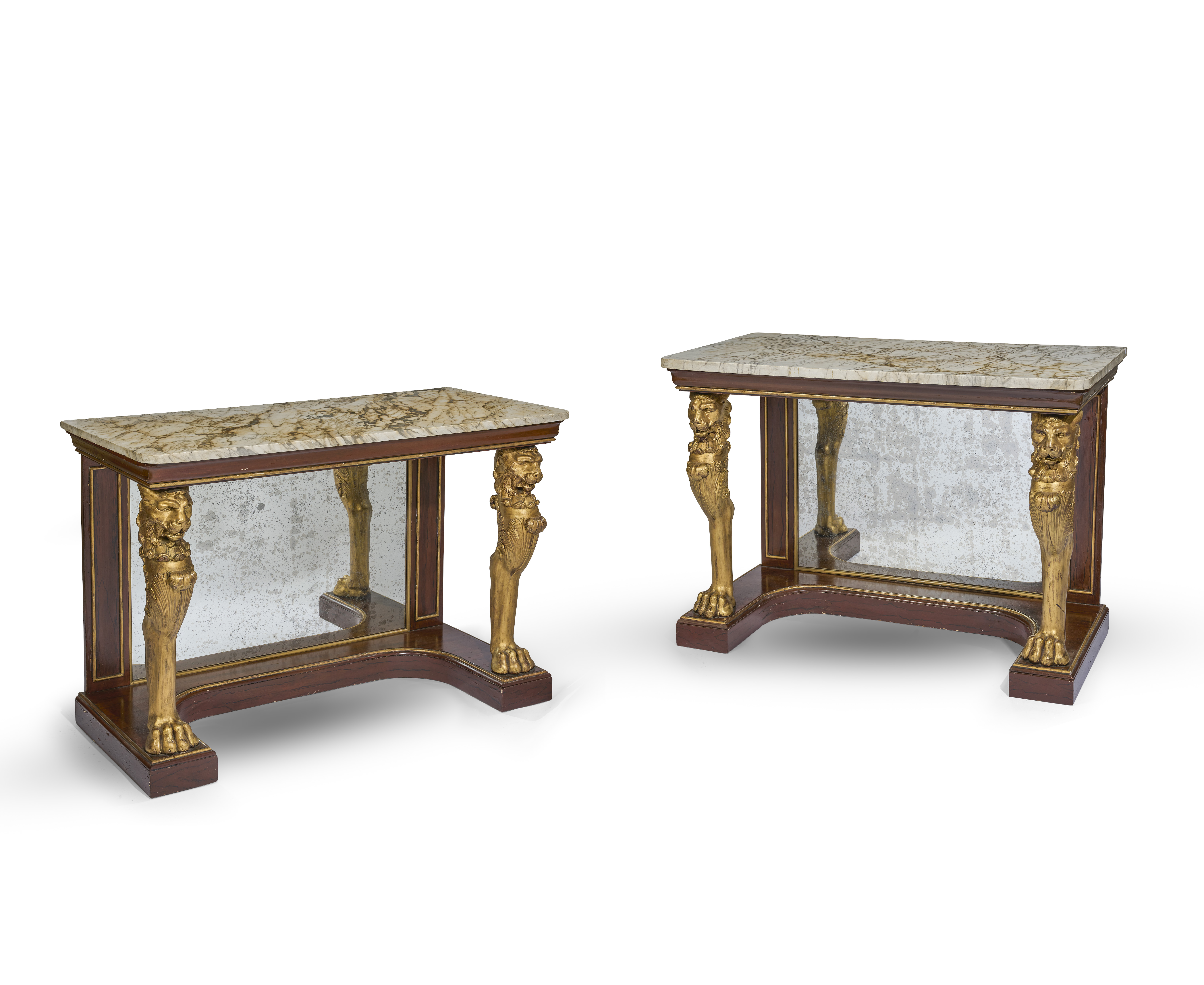 each with a white and grey veined marble top above a moulded mahogany frieze, a pair of giltwood lion head monopodia with foliate carved knees and a mirrored back, on a deep concave faux rosewood plinth (2)