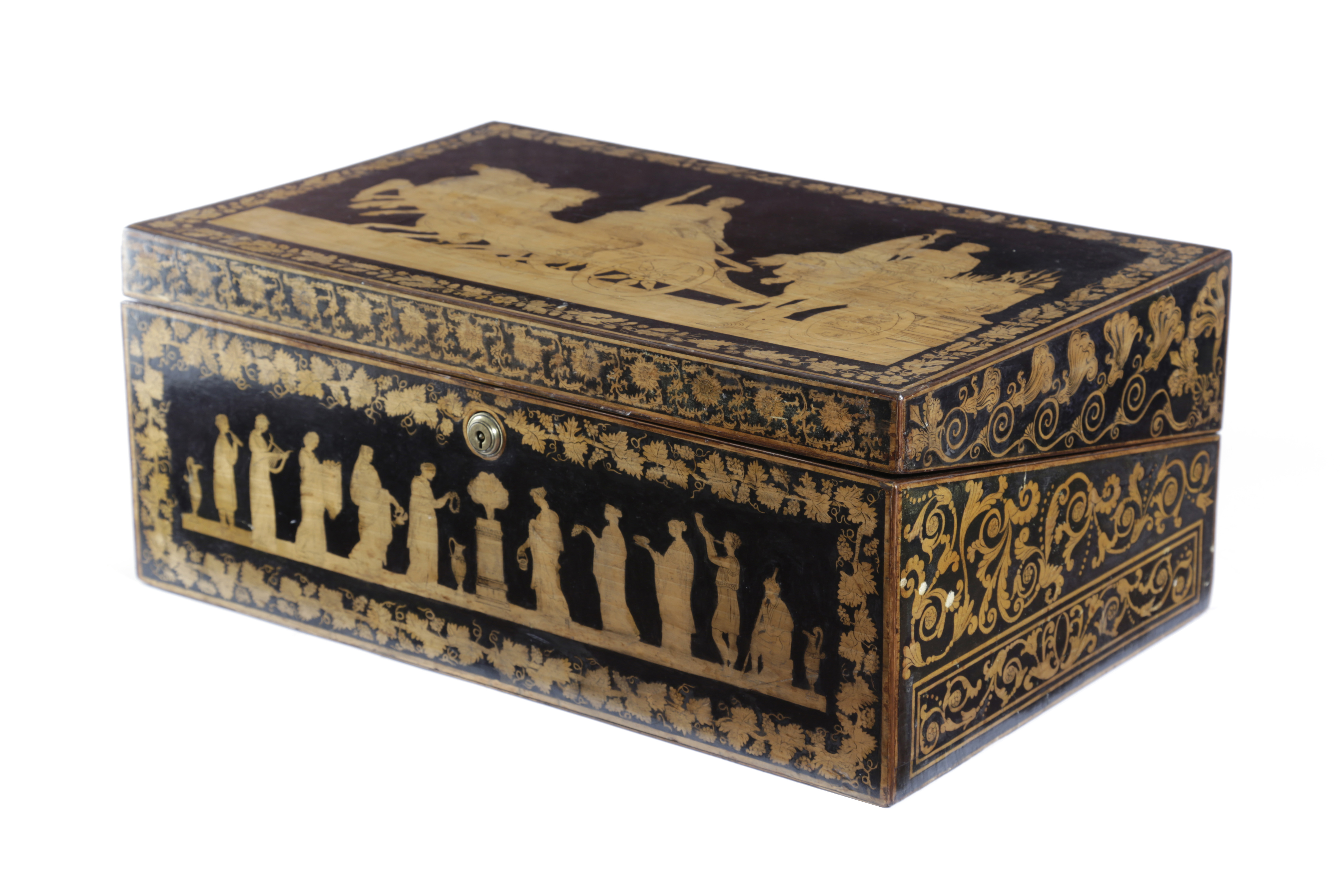 the top with a horse drawn chariot and soldiers inside an oak leaf and acorn border, enclosing a fitted interior with a velvet lined slope and a Bramah lock, the front with figures inside fruiting vines, a drawer to one side