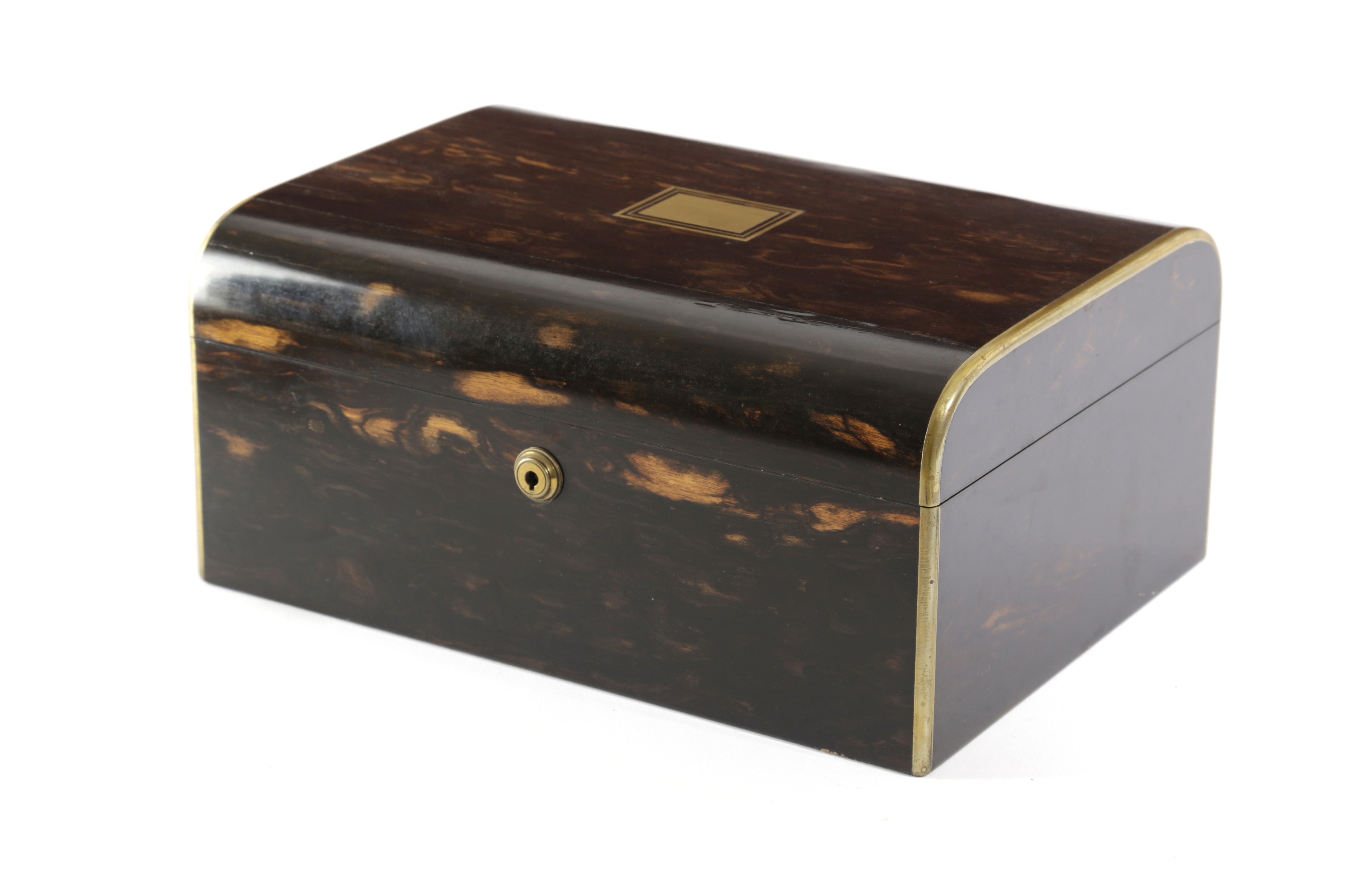 λ A VICTORIAN COROMANDEL AND BRASS BOUND SEWING BOX