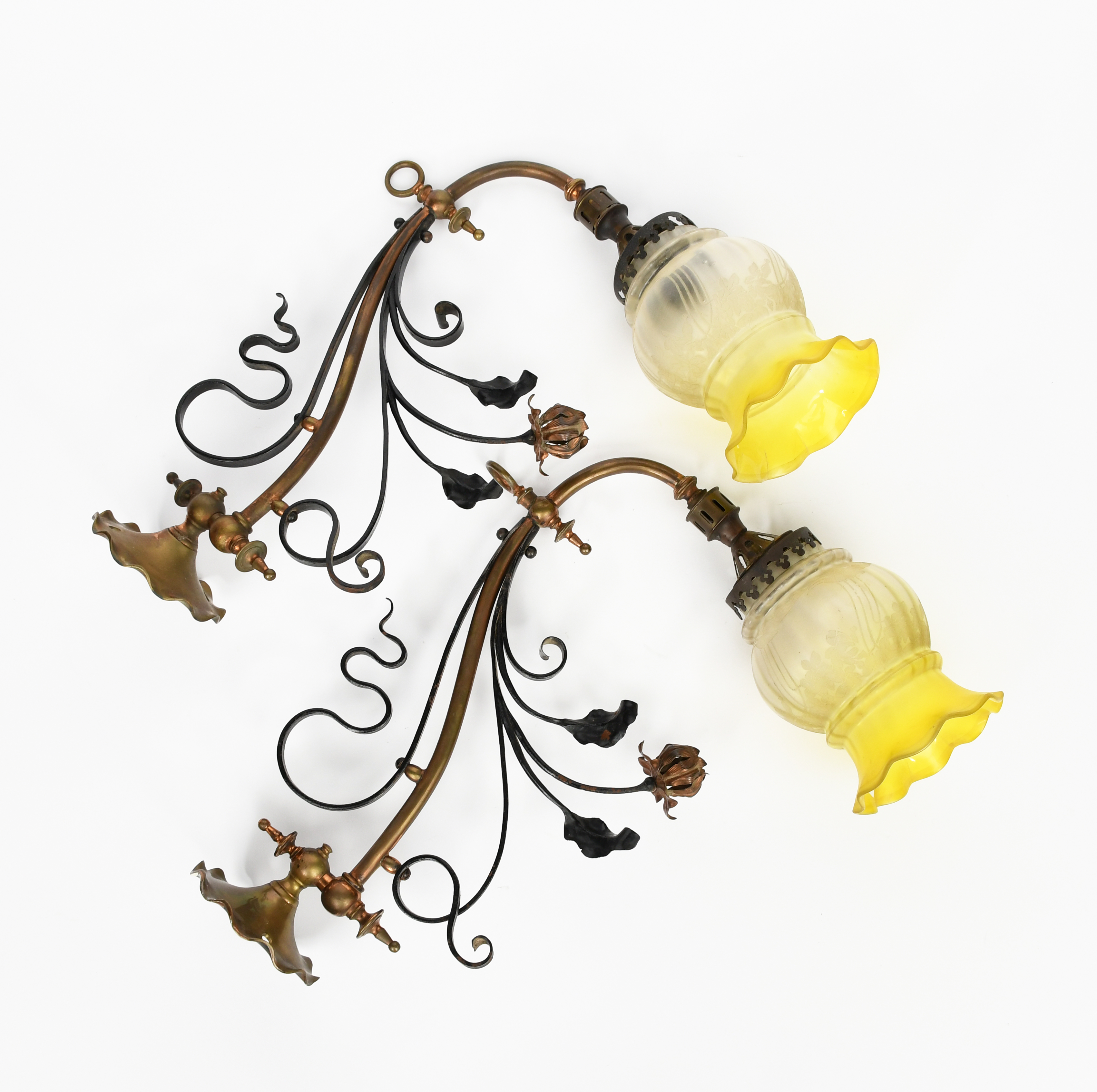 A pair of Art Nouveau patinated metal wall gas-lights, each with articulated wall fitting, the