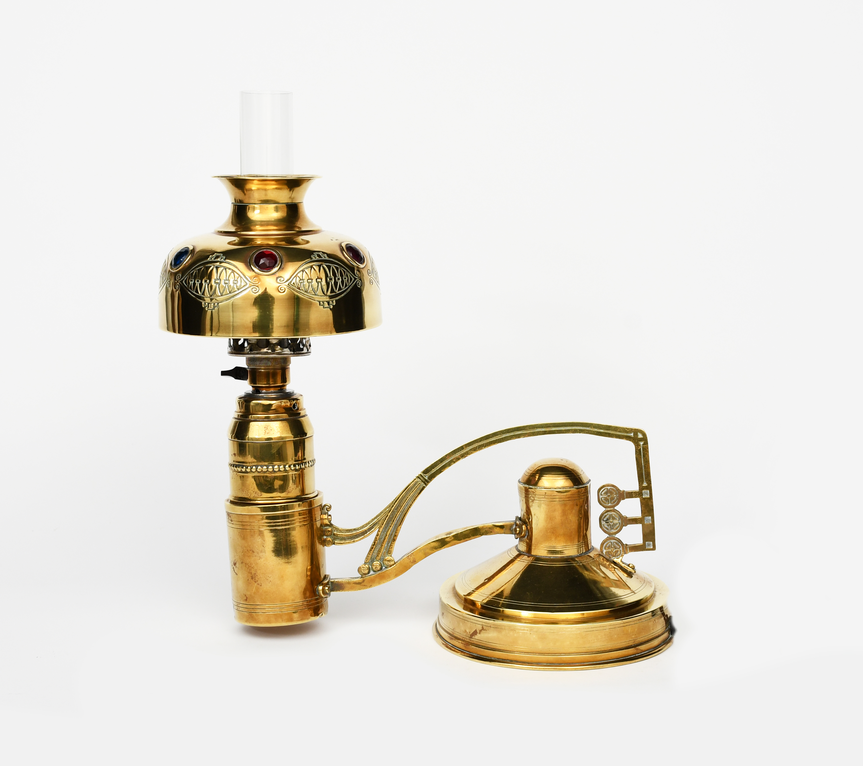 A Continental Secessionist brass desk lamp, counter-balanced circular base with scroll stem cast with stylised flower stems, supporting drum stem with glass jewel set domed shade and glass flume unsigned 30cm wide (3)