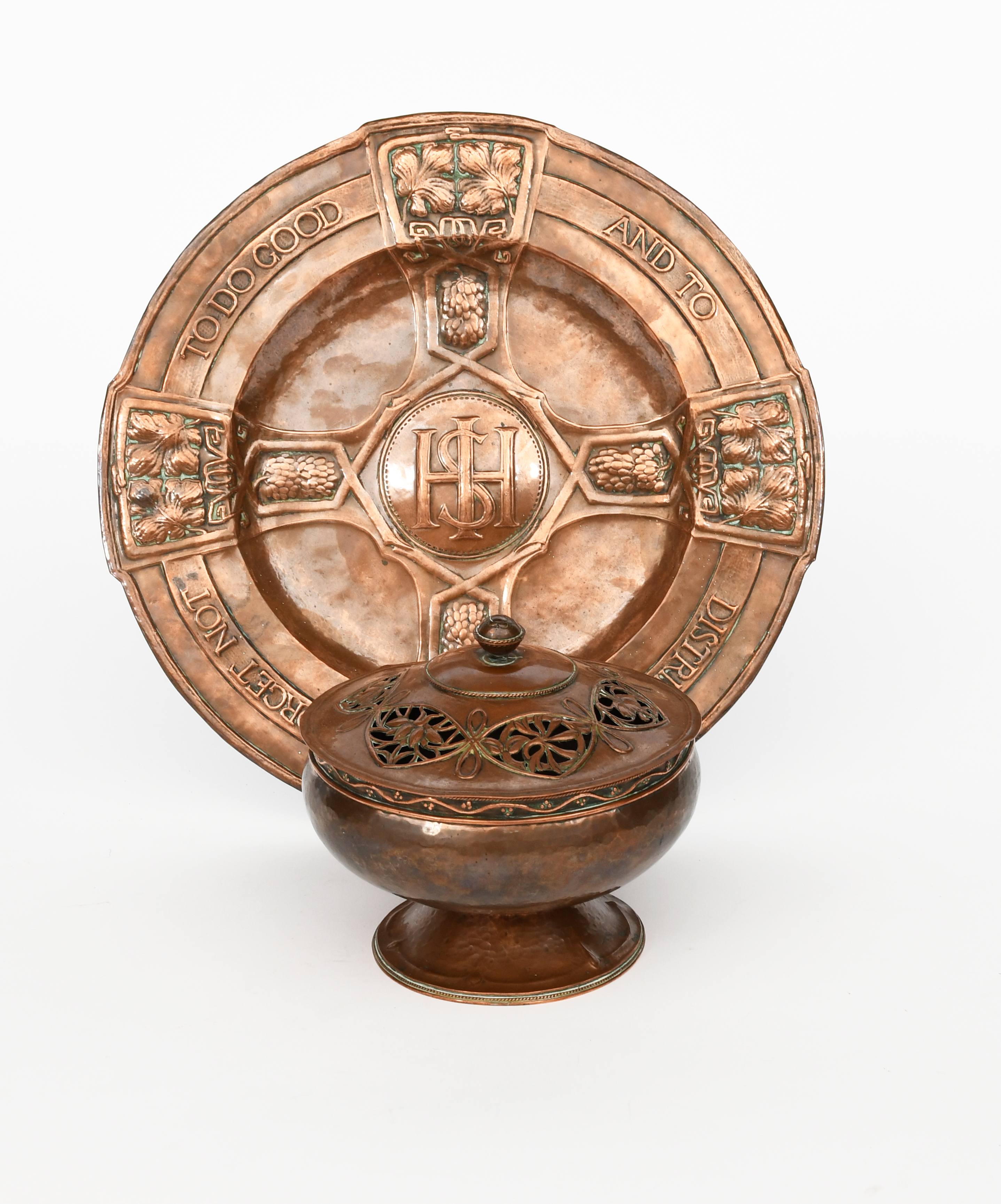 An Arts and Crafts copper pot pourri vase and cover in the manner of the Artificers Guild, the pedestal bowl with hammered finish and band of scrolling berry motif, the cover pierced with a frieze of stylised flower panels, and a copper charger decorated with panels of fruiting vine inscribed Forget not to do good and to disperse, unsigned, 16cm. high (pot and cover), (3)