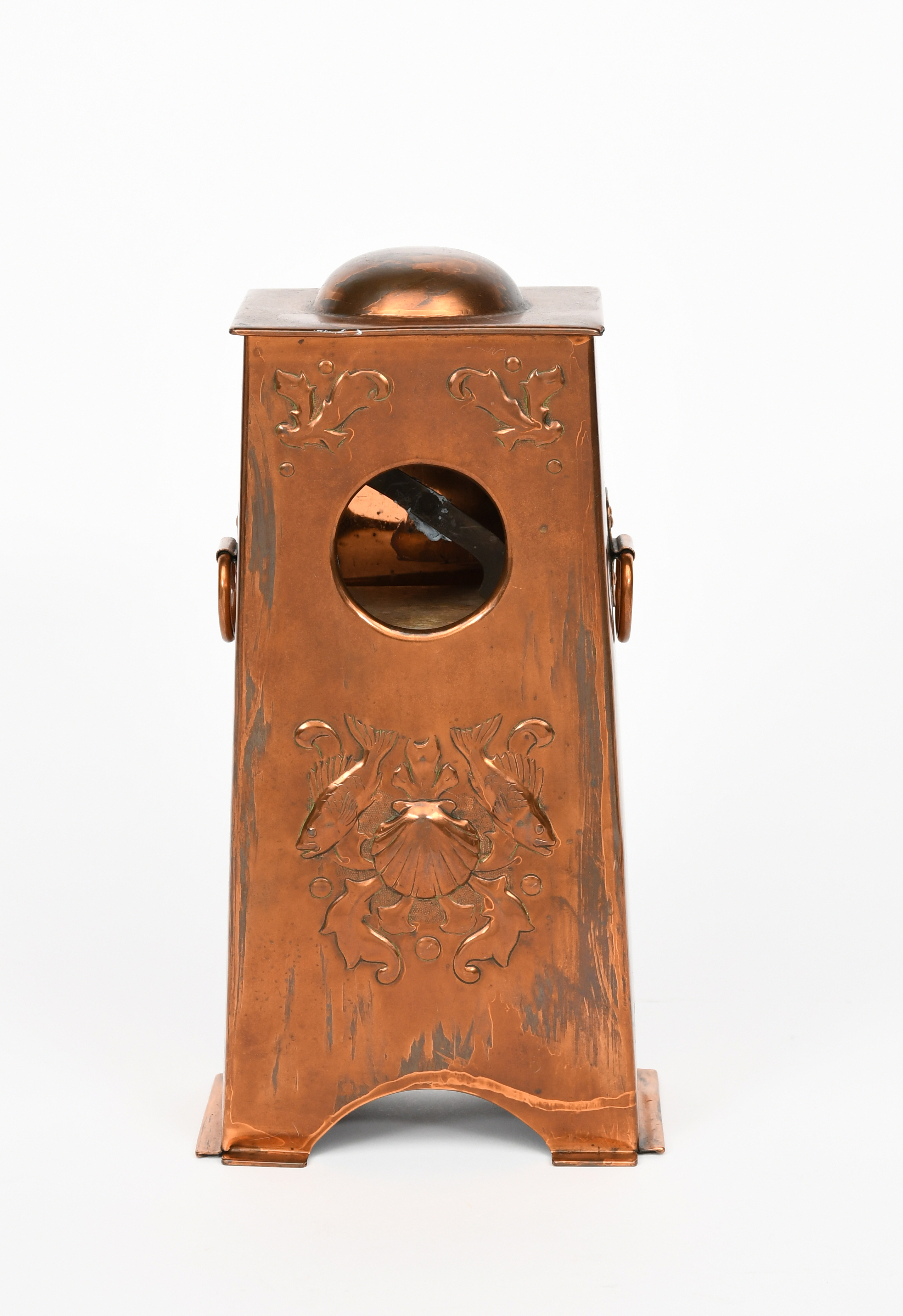 A Newlyn Industrial Class repousse copper mantel clock, tapering, rectangular form, repousse decorated with scaly fish flanking a scallop shell, with applied loop handles, stamped Newlyn, 27.5cm. high