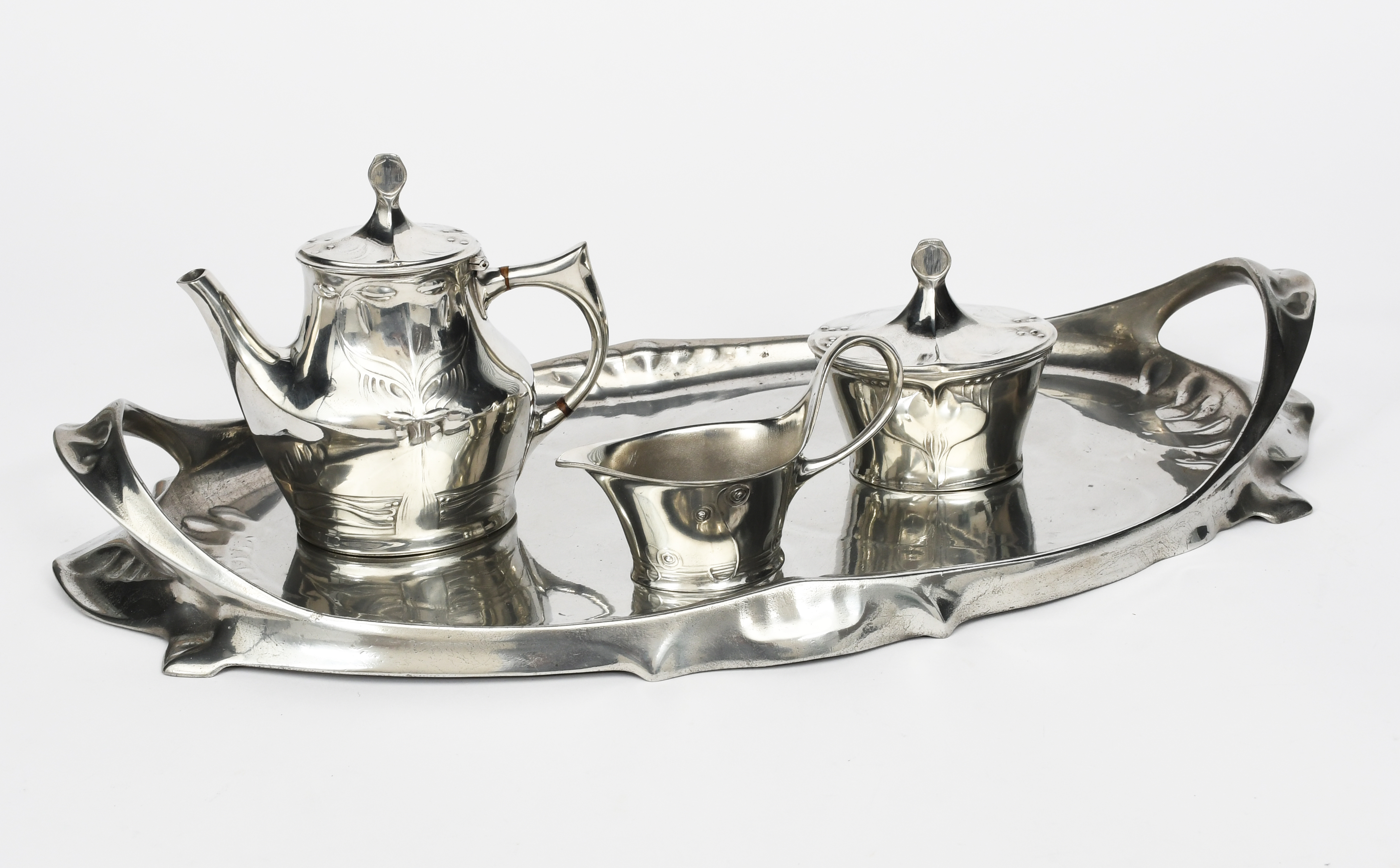 A Kayserzinn pewter tea set designed by Hugo Leven, model no. 4402, cast in low relief with Art Nouveau flower design, comprising, teapot and hinged cover, with leather insulators, milk-jug and sugar basin on shaped, twin-handled tray stamped marks, 54cm. wide (5)