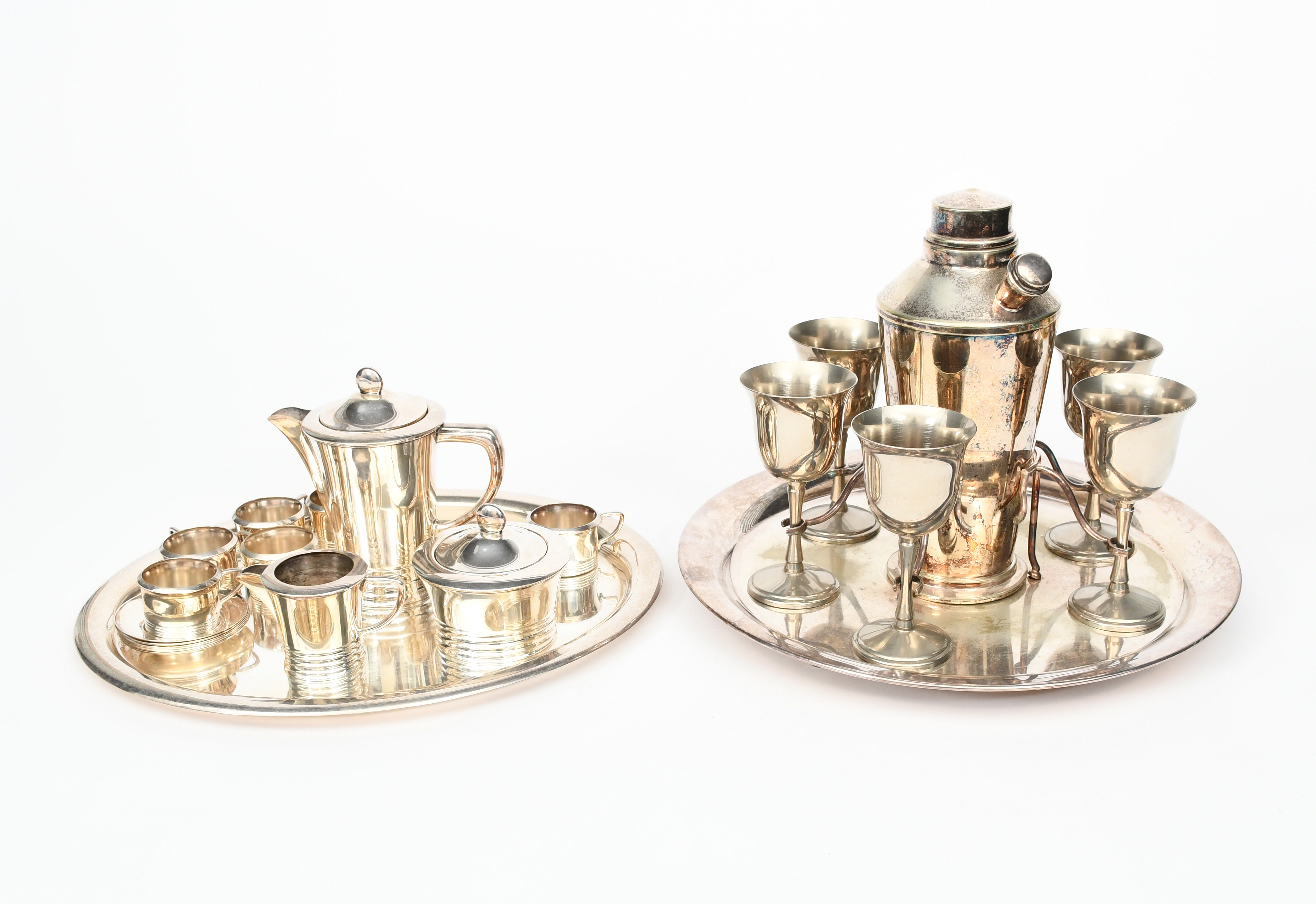 An Art Deco English electroplated cocktail shaker set, hydrant style shaker with fitted tray and six goblets, and a continental electroplated coffee set for six, comprising coffee pot and cover, milk-jug, sugar basin and cover, six cups and saucers on a tray, stamped marks, 24.5cm. high (25)