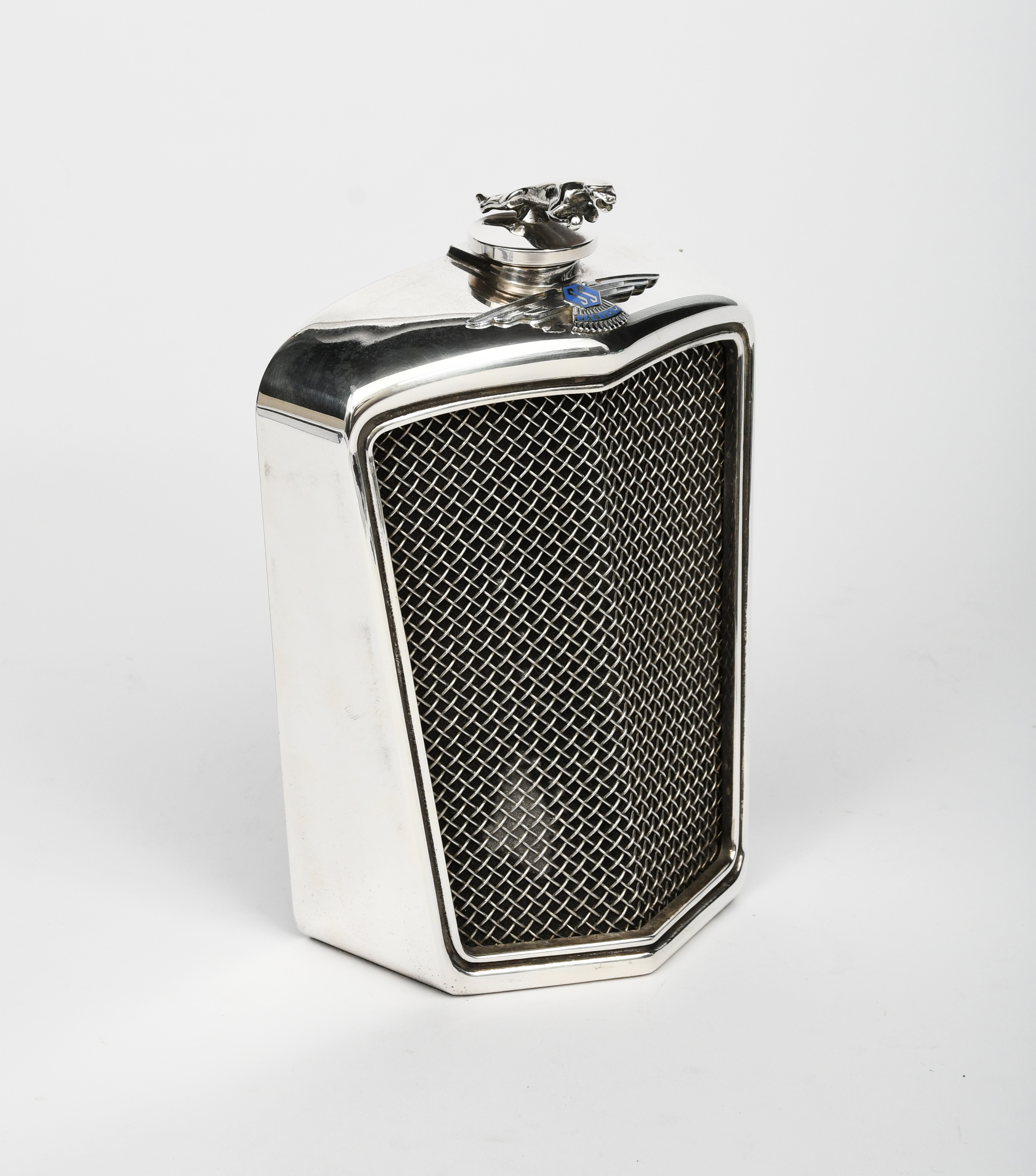 A Classic Stable Ltd Jaguar SS radiator grill flask, with screw cap, blue enamelled badge, applied
