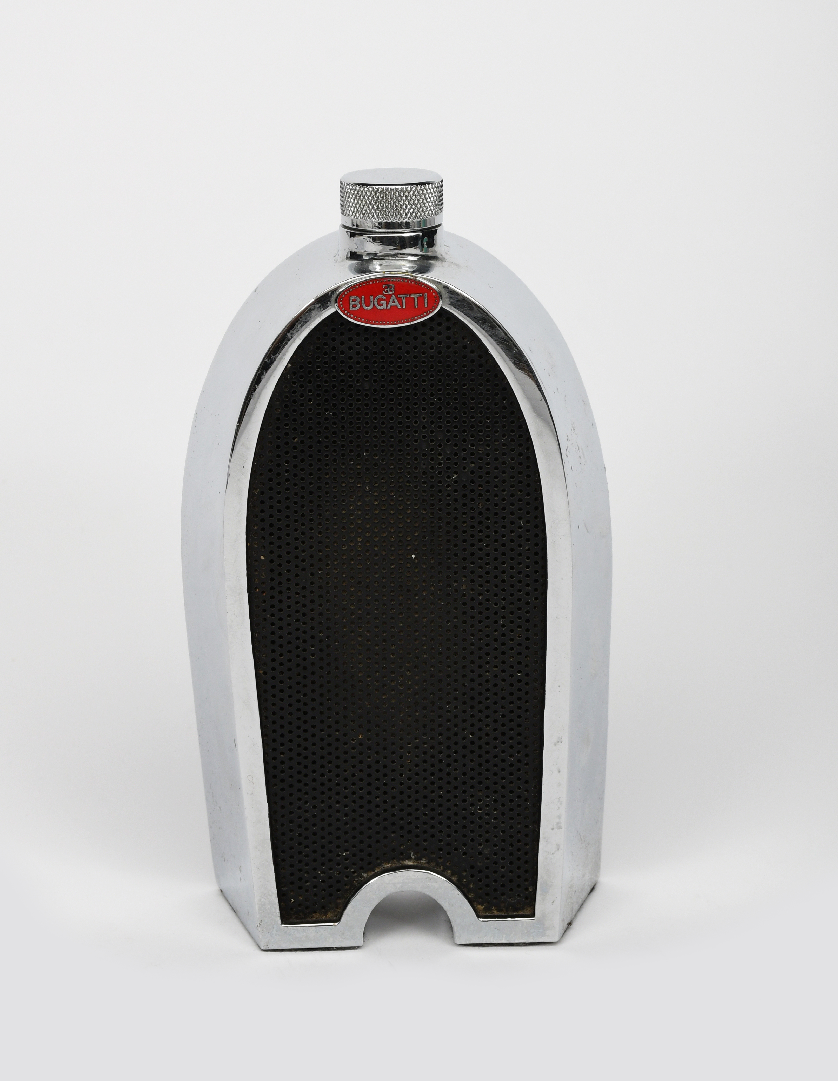 A Bugatti radiator flask probably Ruddspeed, chromed metal with enamelled badge, unsigned, 19.5cm.