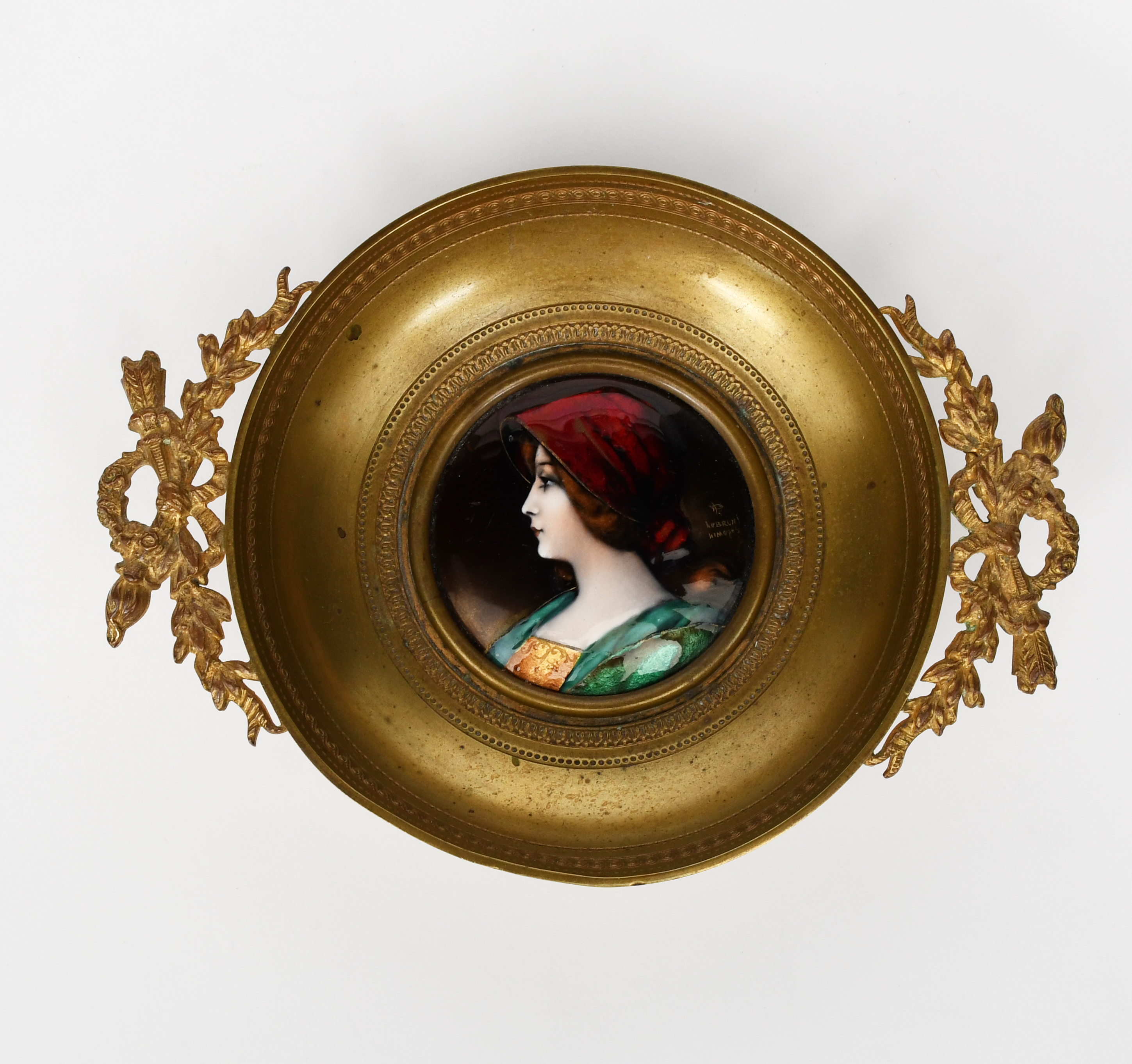 A Limoges enamel mounted metal dish by Lebrun, the circular bowl surmounted with cast foliate handles, set to the well with a circular enamel of a lady in colours and gilt, signed with monogram and Lebrun Limoges, 16.5cm. wide