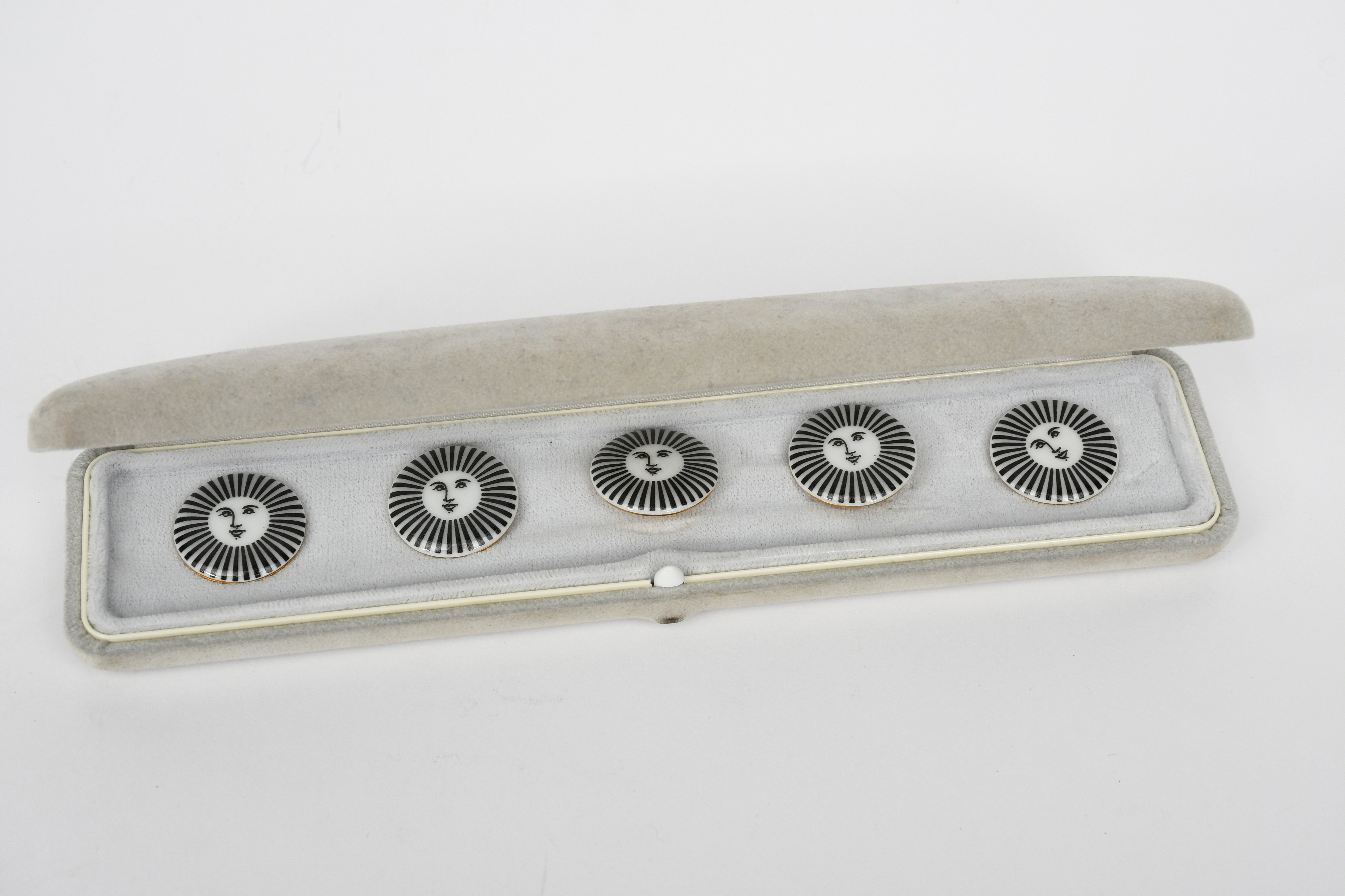 A set of five buttons designed by Piero Fornasetti, each ceramic button printed in black with a sun