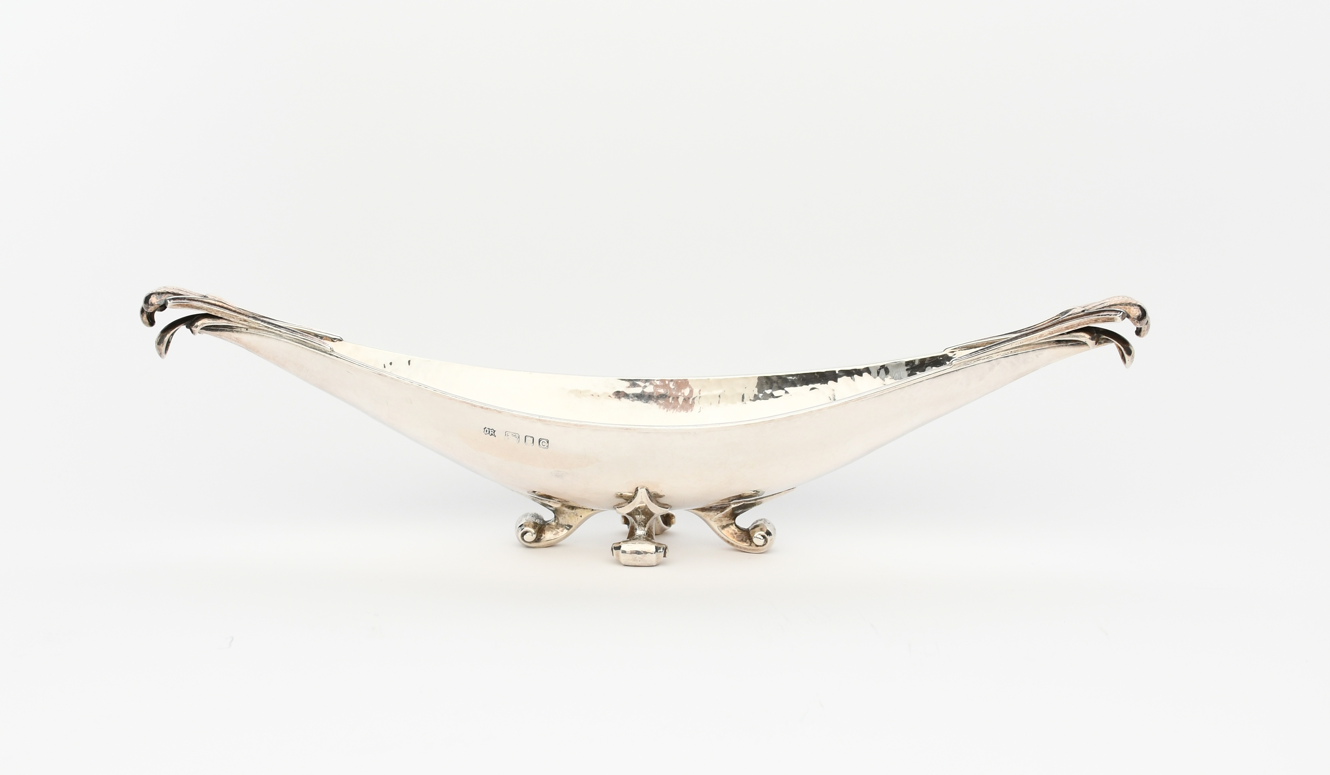 An Omar Ramsden silver dish, elliptical hammered bowl with foliate terminals, on four scroll feet,