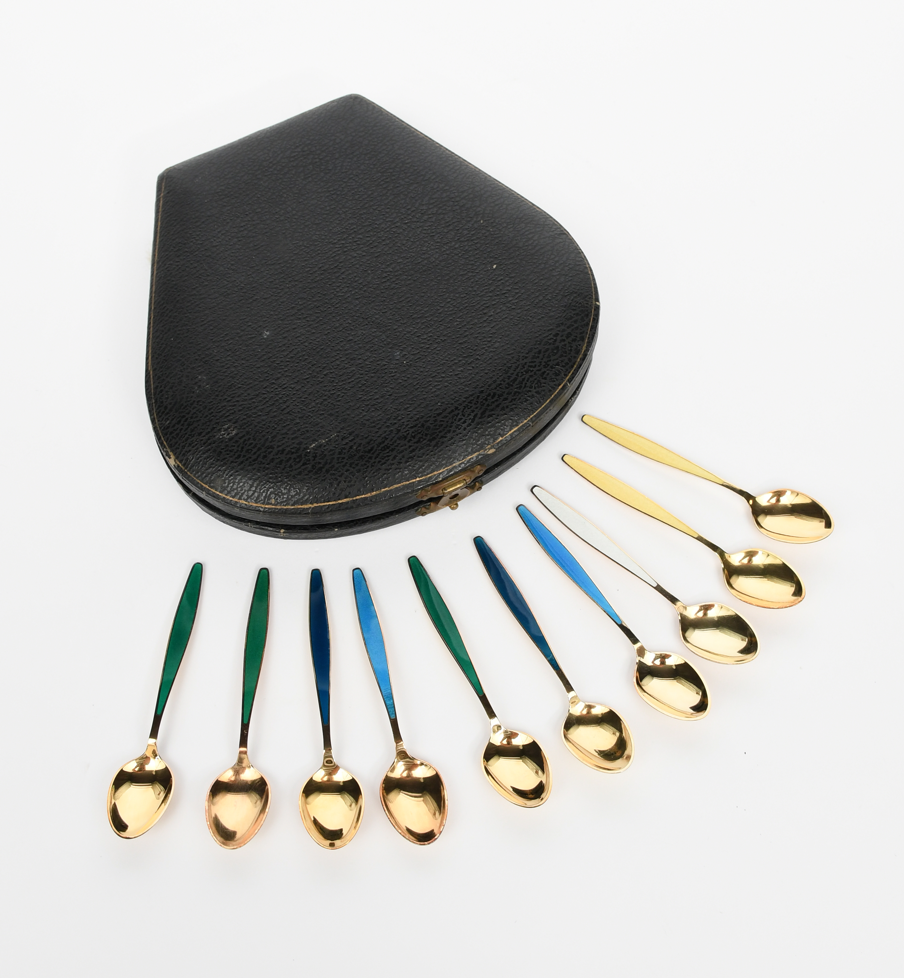 A set of ten Georg Jensen silver gilt tea spoons, the handles enamelled in yellow, green, blue and