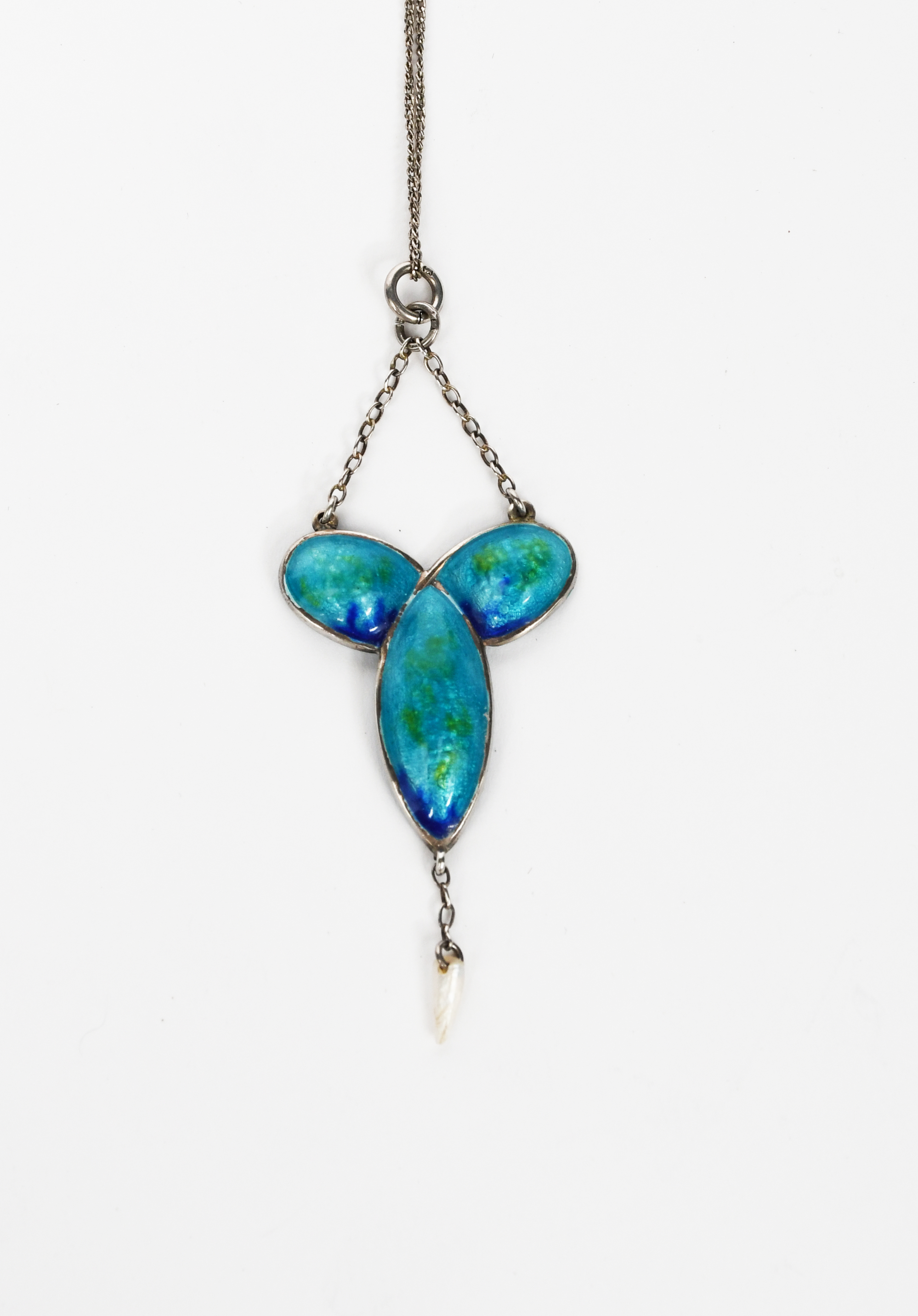 Gourdel Vales and Co silver and enamel pendant necklace, trefoil form enamelled in blue, with pearl